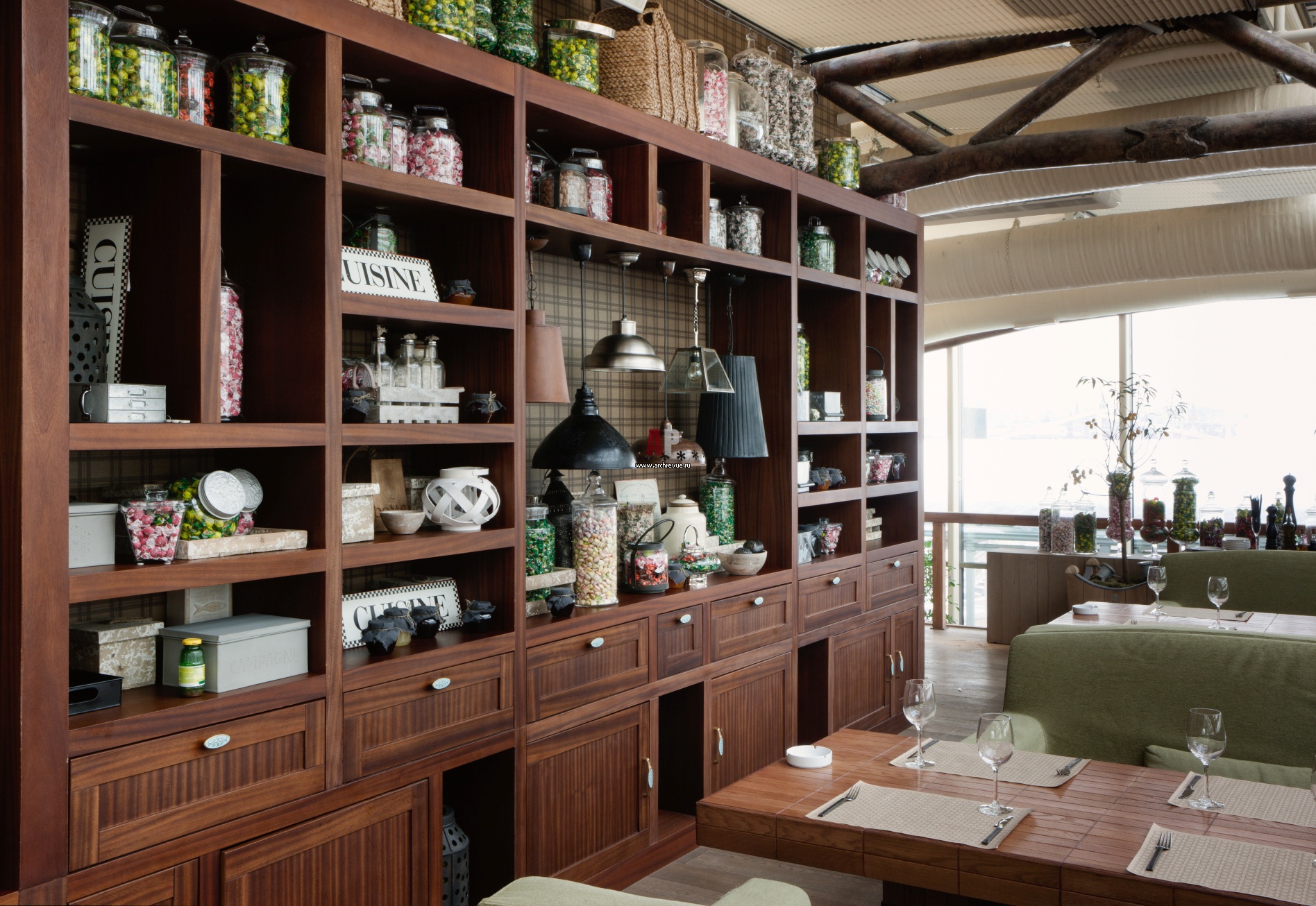 Стеллажи, столы, диваны и двери были изготовлены по авторским эскизам из массива и шпона красного дерева мастерами компании «Диском -10 ».