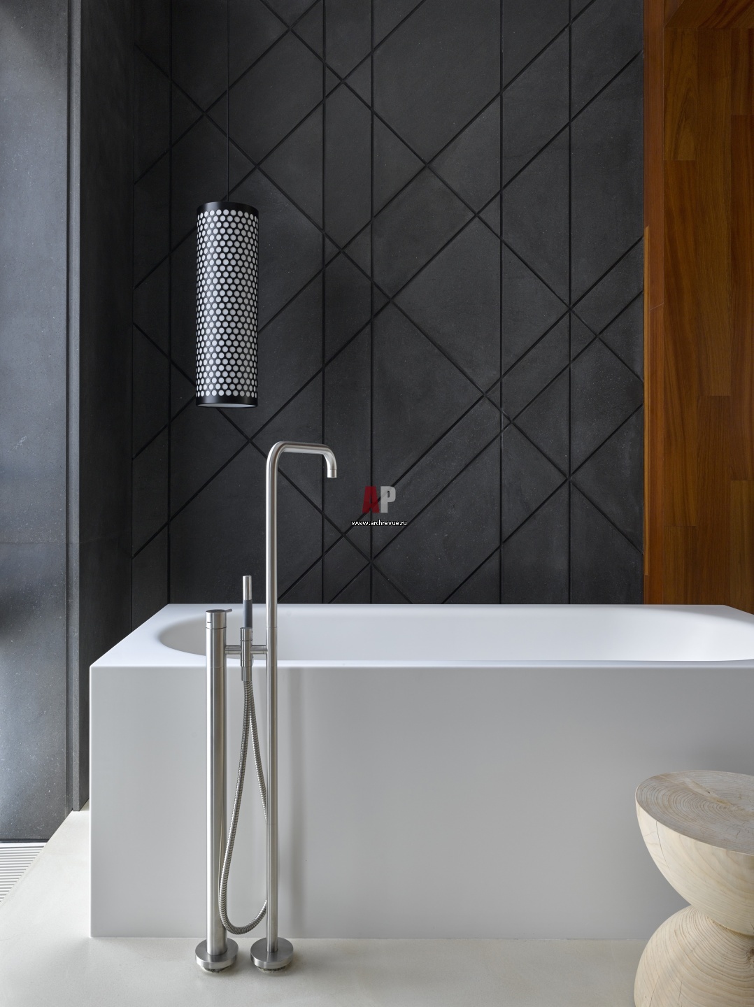 На стене панели из базальта. Ванна, Mauersberger. Смесители, Vola. Свет, Gubi.