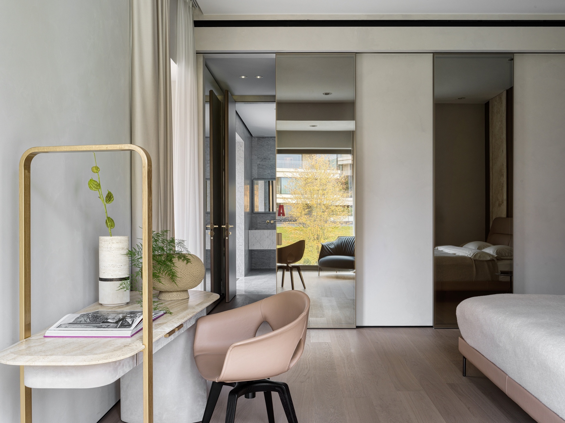 Спальня. Стеклянные раздвижные двери, ADL. За ними – ванная комната. Письменный стол, Baxter. Стул, Poltrona Frau.