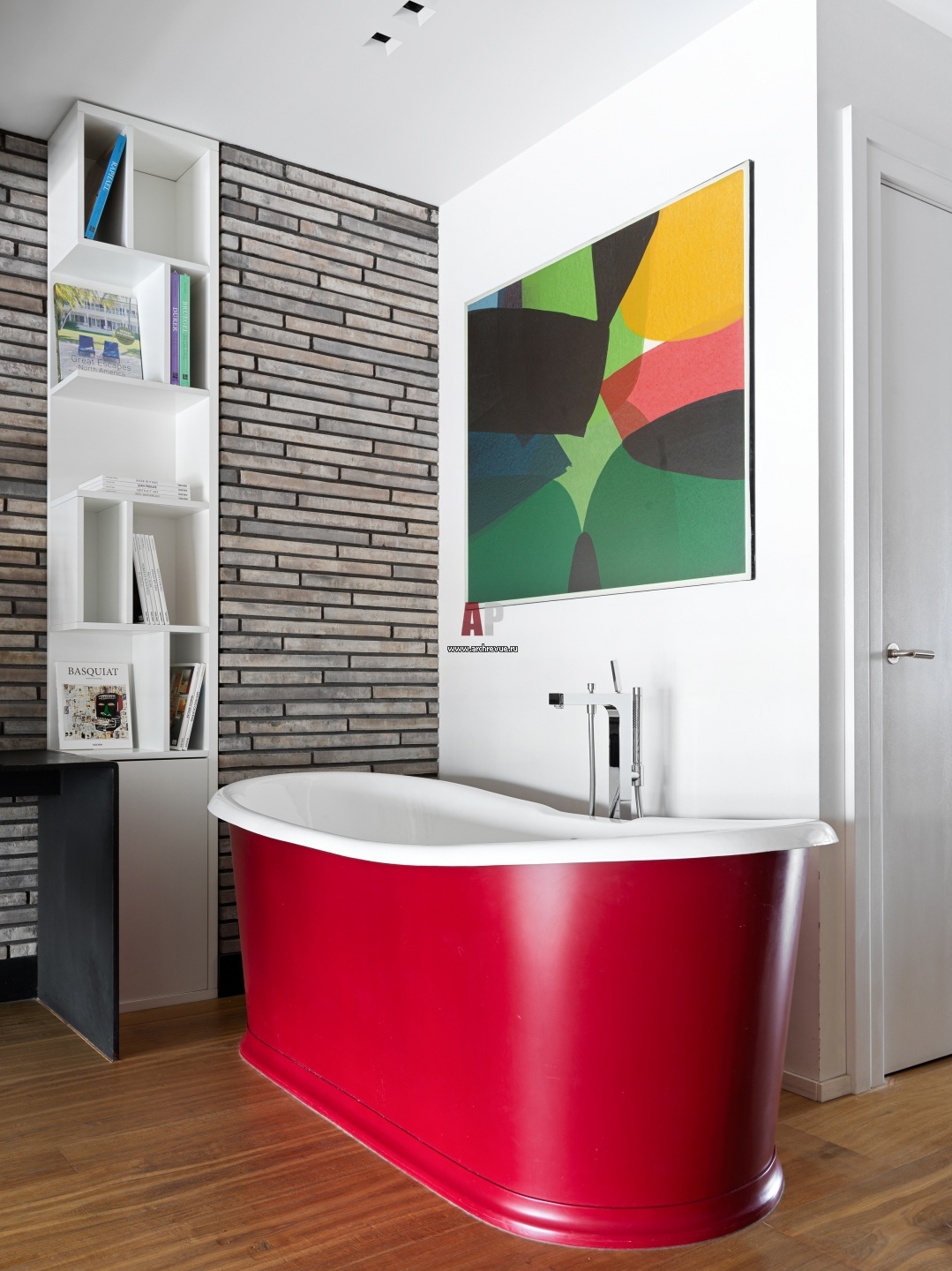 Красная ванна интегрирована в общее пространство второго этажа. Напротив нее – большое витражное стекло, через которое можно было созерцать московскую улицу.