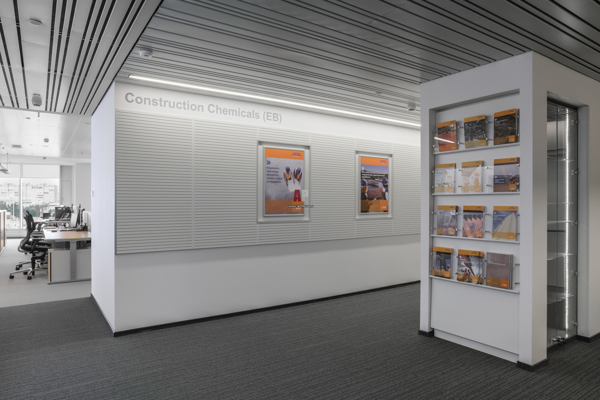 Фото интерьера офиса химического концерна. Рабочие open space предваряют витрины и информационные стойки различных департаментов.