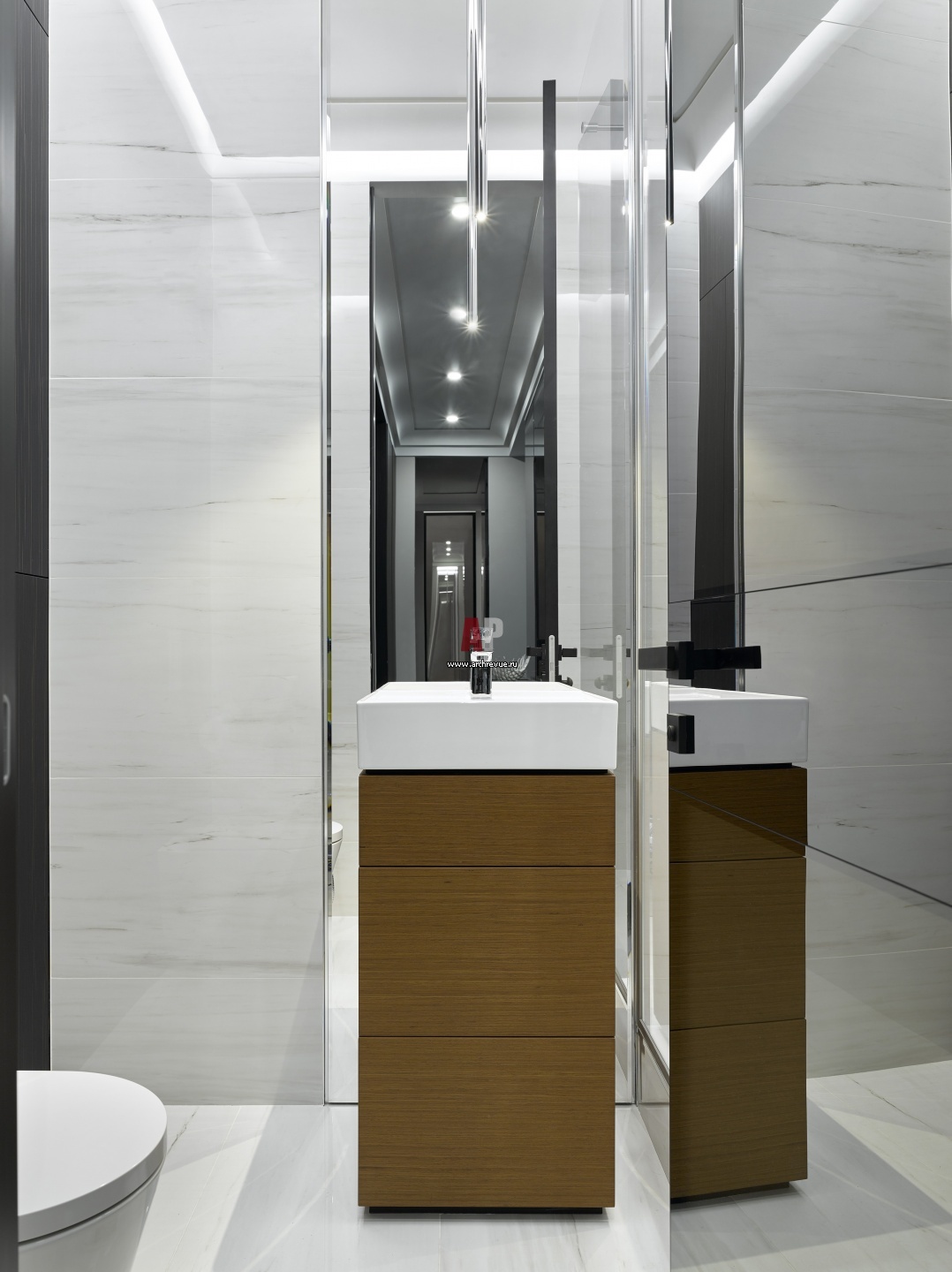 Гостевой санузел имеет небольшую площадь. Зеркала оптически увеличивают помещение. Сантехника, Duravit. Смеситель, Hansgrohe.