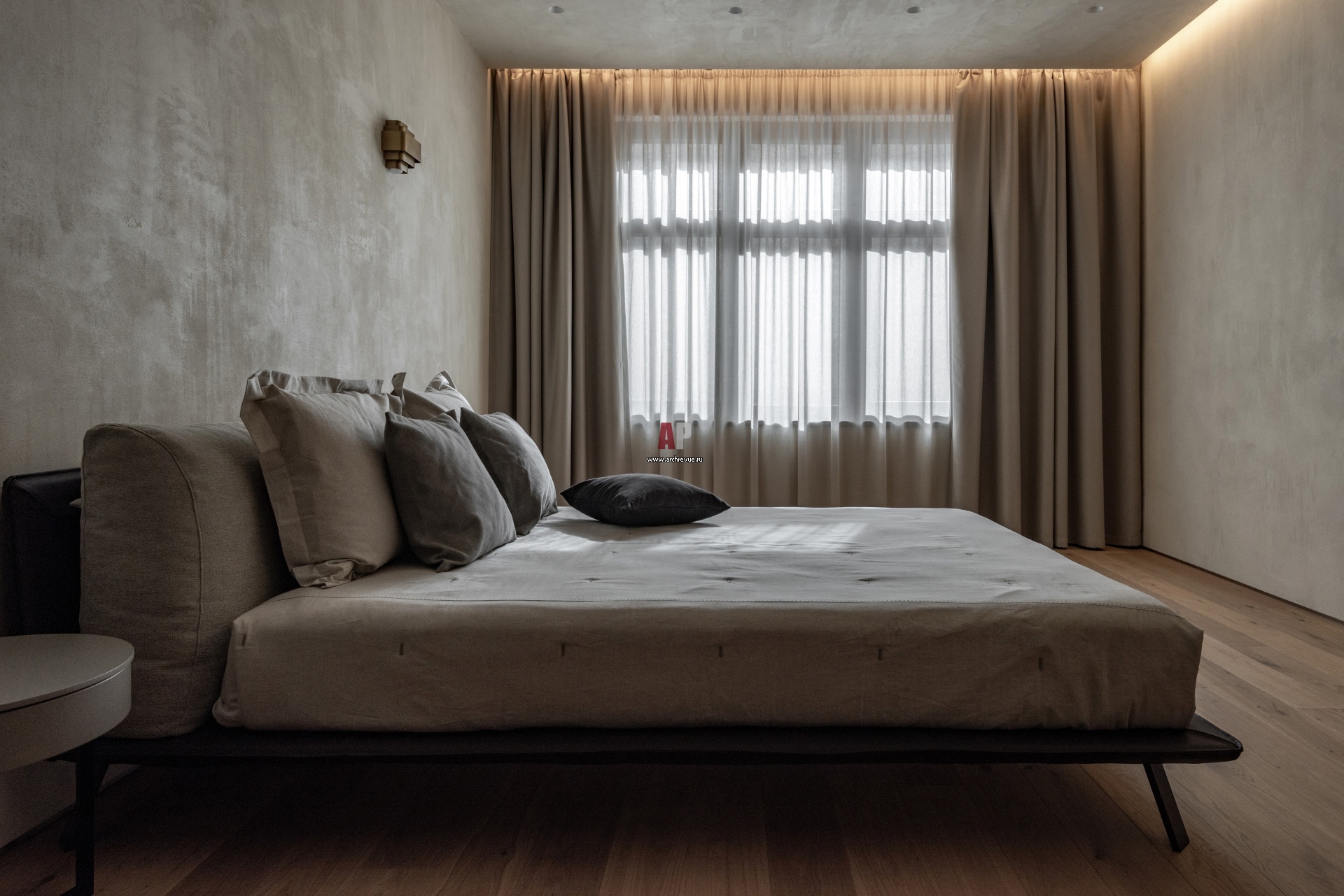 Гостевая спальня. Стены и потолок оформлены декоративной штукатуркой, имитирующей натуральный песчаник. Кровать, DiTre Italia.