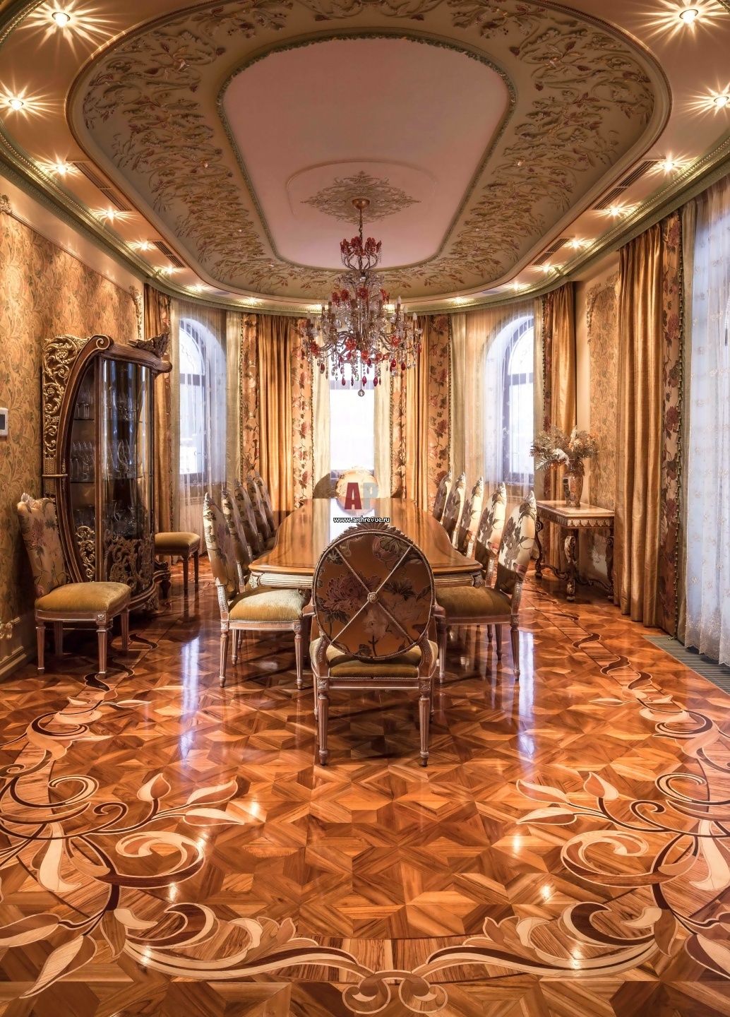 Столовая выдержана в парадном дворцовом стиле. Центральная люстра с красными цветами.