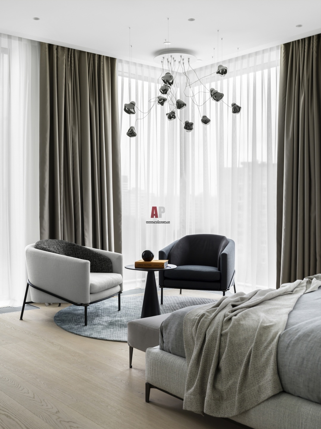 Зона отдыха в спальне. Двухцветные кресла, Minotti. Столик, Baxter. Разветвленный светильник с абажурами в виде цветов, Bocci.