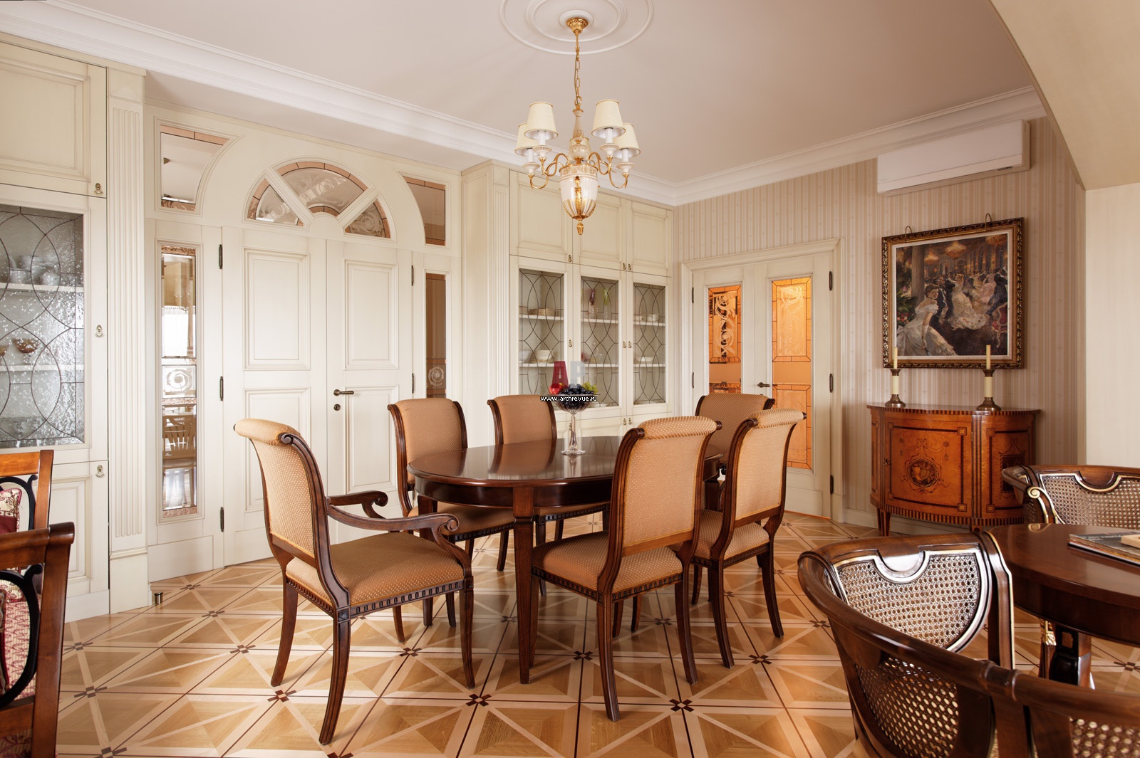 По просьбе заказчицы, проем между столовой и кухней закрыли распашными дверями, облегчив дверной проем стеклянным витражом. В качестве межстенной перегородки использовали систему шкафов для хранения посуды со стеклянными дверцами, поставщик «ОРЕХ-СП»