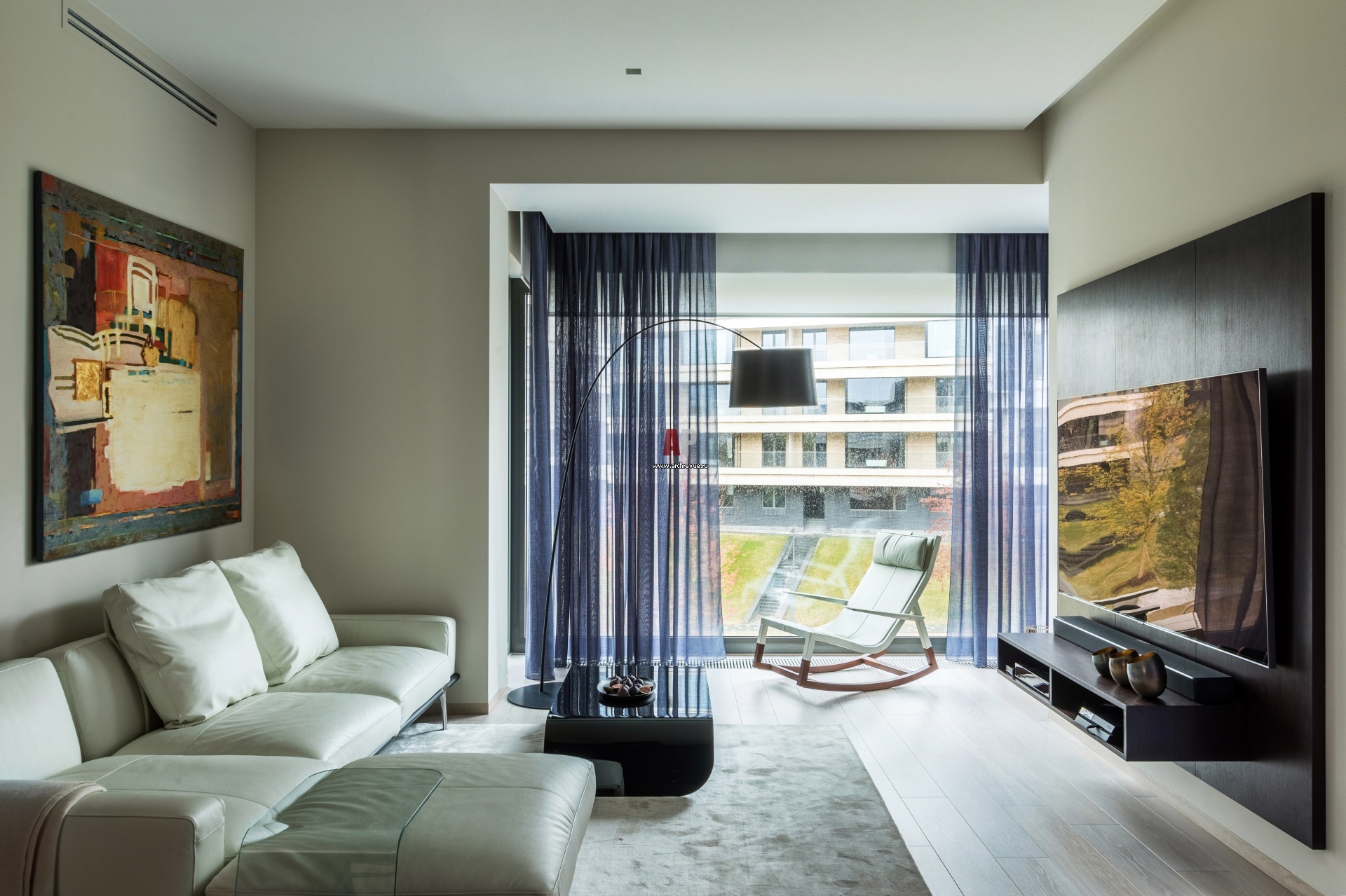 Московская квартира с панорамными окнами у воды. Интерьер гостиной.