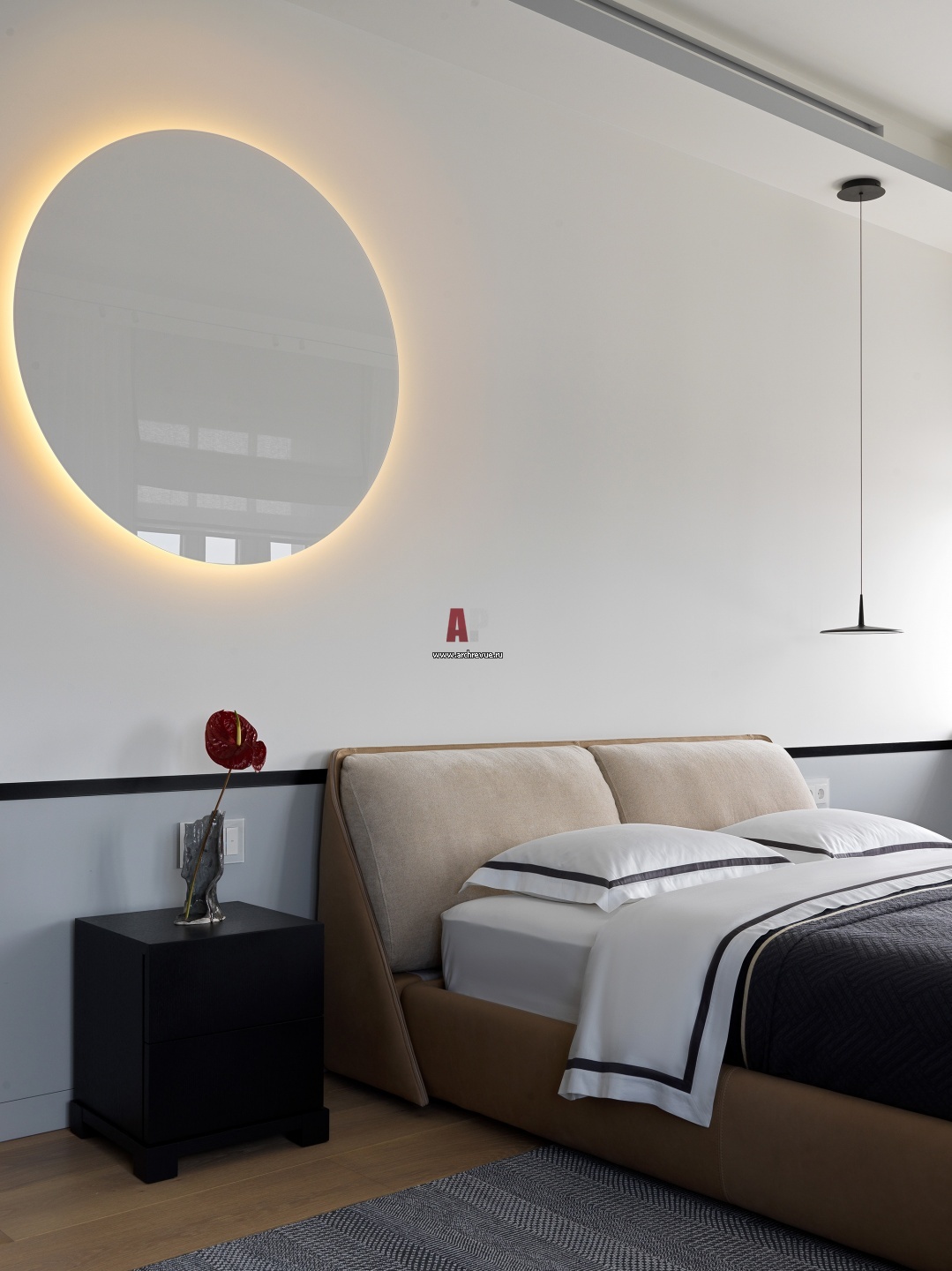 Мужская спальня. Кровать, Alivar. Тумба прикроватная, Meridiani. Стену украшает светильник-круг из белого стекла, изготовленный на заказ компаний «Борус».