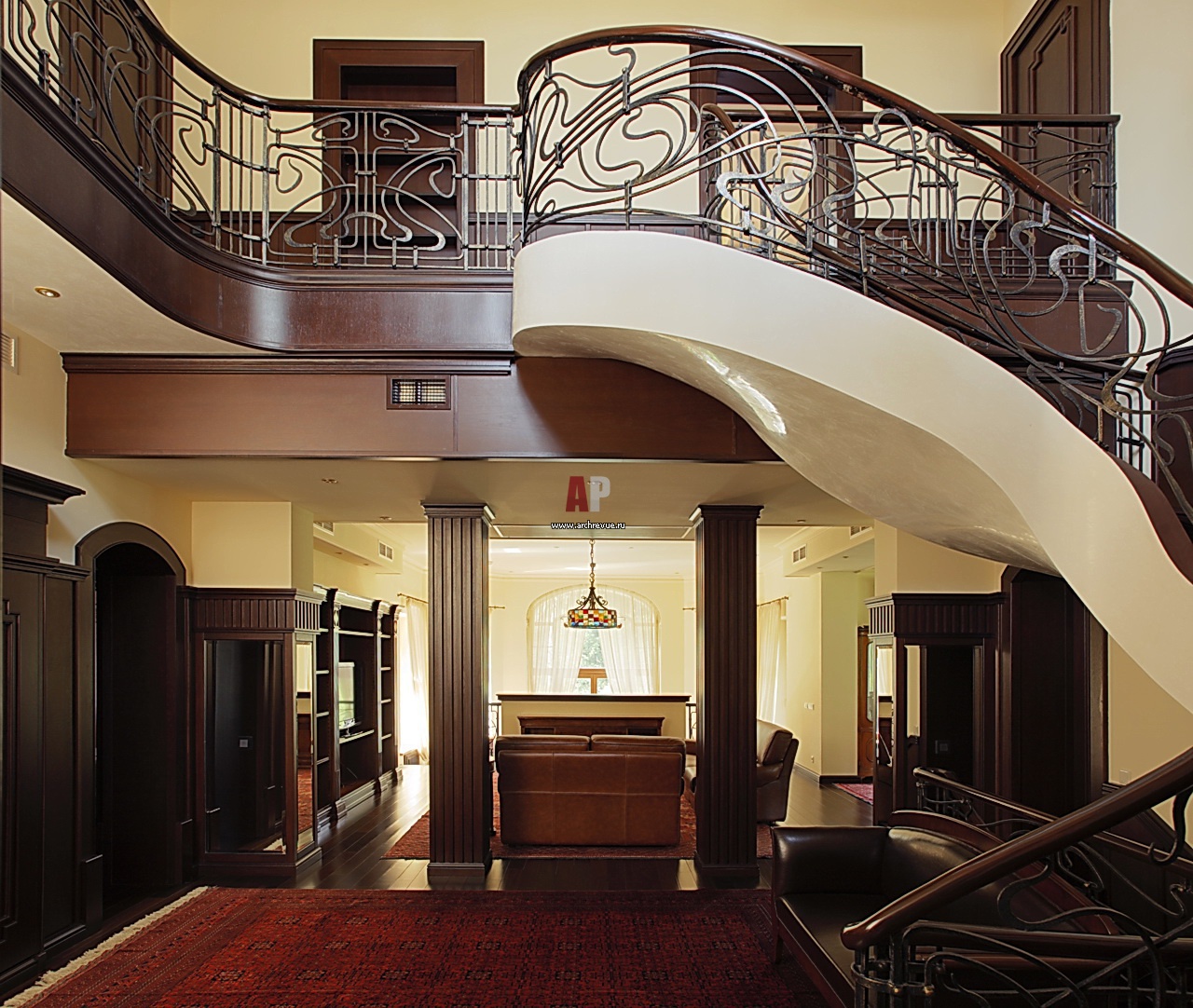 Главный декоративный акцент дома – широкая лестница, которая изгибается волной.