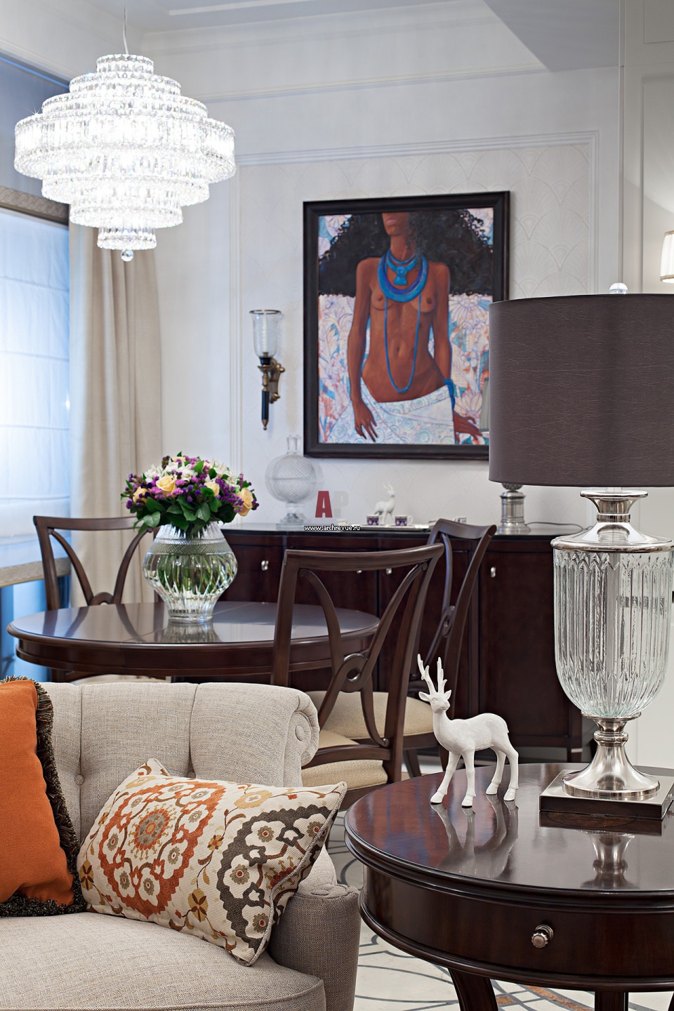 Фото интерьера гостиной квартиры в стиле неоклассика. Строгость интерьеру придает аскетичная цветовая гамма: темные силуэты мебели на белом фоне, яркая живопись.