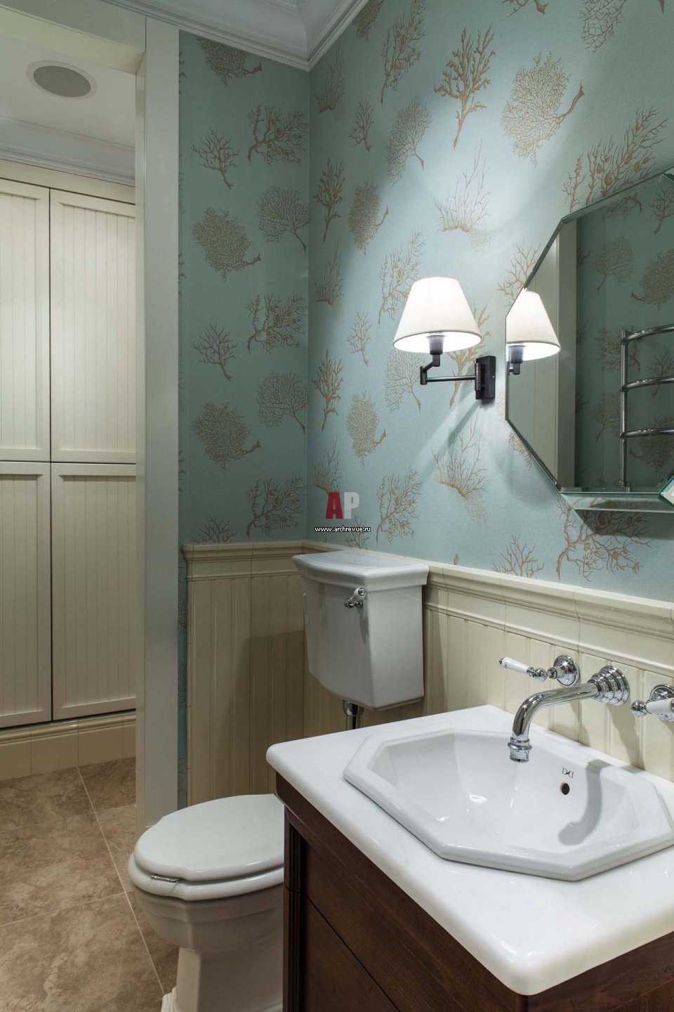 Стены в интерьере санузла оформлены обоями, низ облицован светлой керамической плиткой, имитирующей деревянные буазери. Сантехника, Villeroy & Boch.