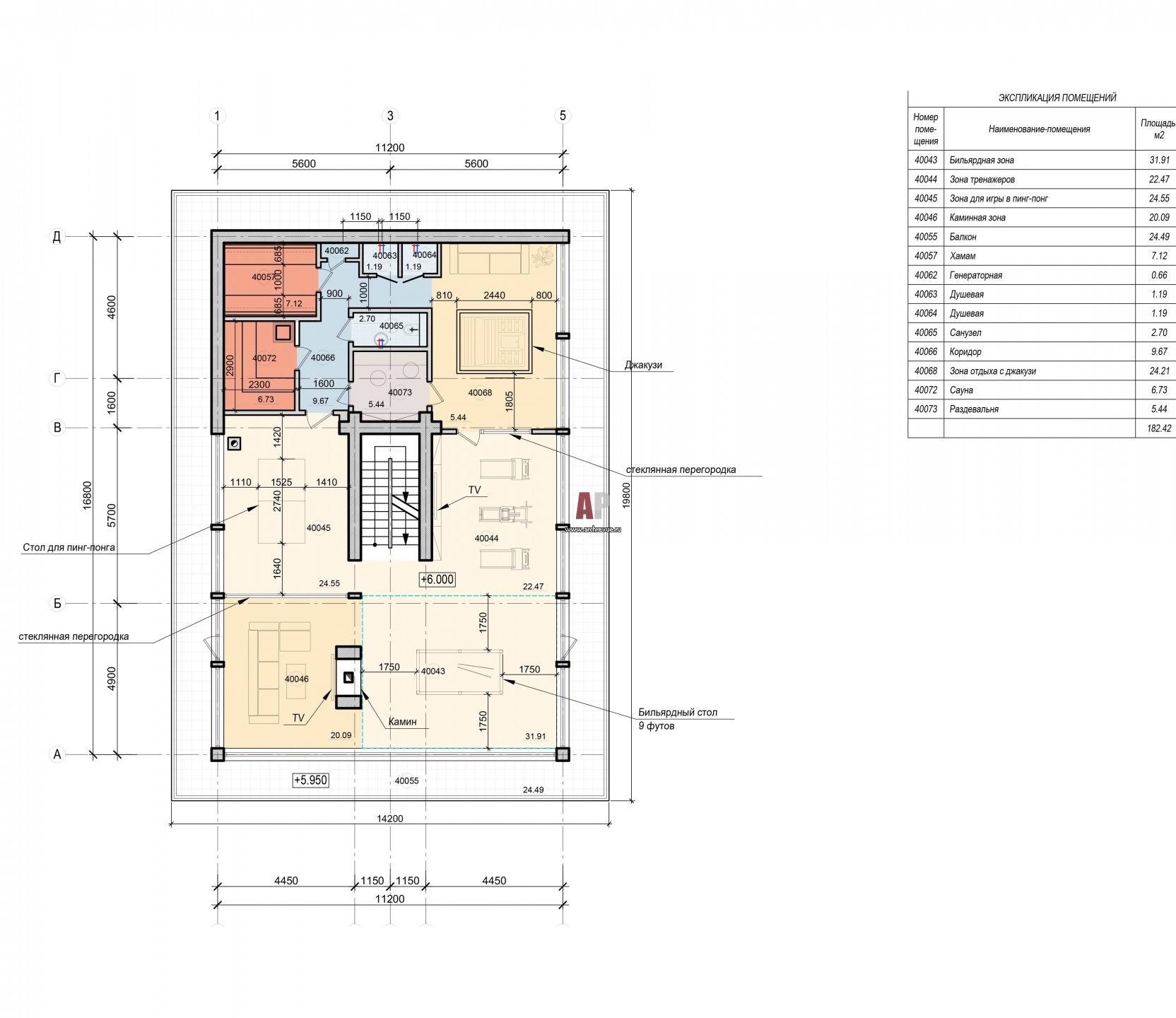 План мансарды пятиэтажного дома из кело. Общая площадь – 1054 кв. м. Жилая площадь – 700 кв. м. Высота дома от нулевой отметки в коньке 13.000 и -5600 вниз.
