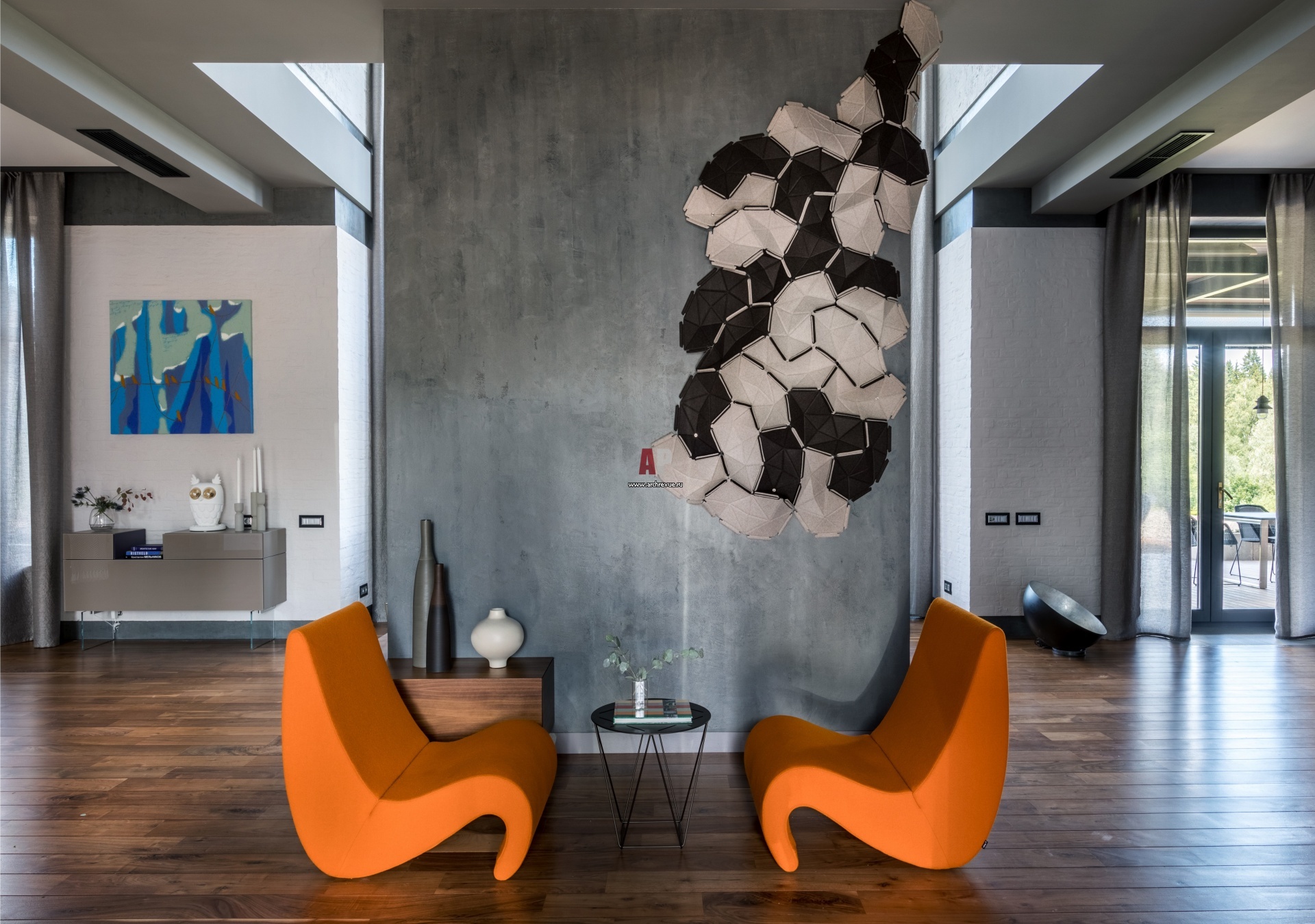 Интерьер холла. Оранжевые кожаные кресла, Vitra, модель Amoebe, дизайнер Вернер Пантон. Столик, Walter Knoll. Украшение помещения – панно из фетра Clouds, Ligne Roset, дизайнеры Эрван и Ронан Буруллек.