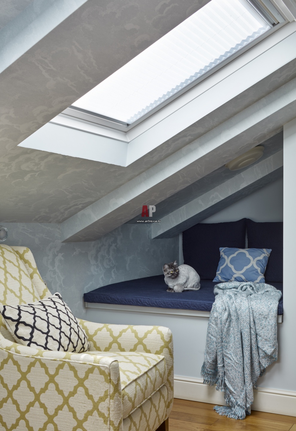 В нише на скосе мансардной кровли сделана лежанка для чтения. Встроенная мебель, «Ассоциация русских мастеров».