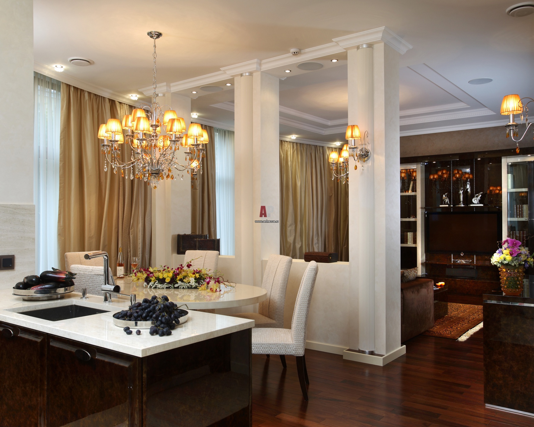 Дизайн зоны столовой в гостиной. Легкая неоклассическая перегородка с лепными колоннами отделяет диванную группу. Пол выстлан штучным паркетом из тонированного ореха, поставщик «Мир Паркета».