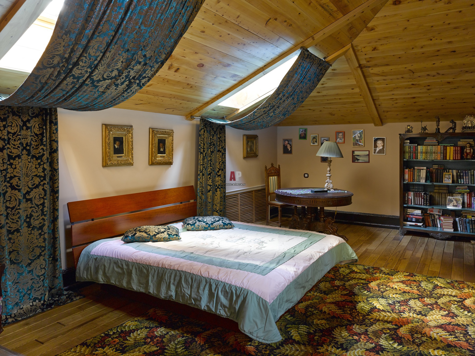 Детская комната в мансардном этаже. Потолок зашит доской ореха. Шторы из синего бархата с травлением.