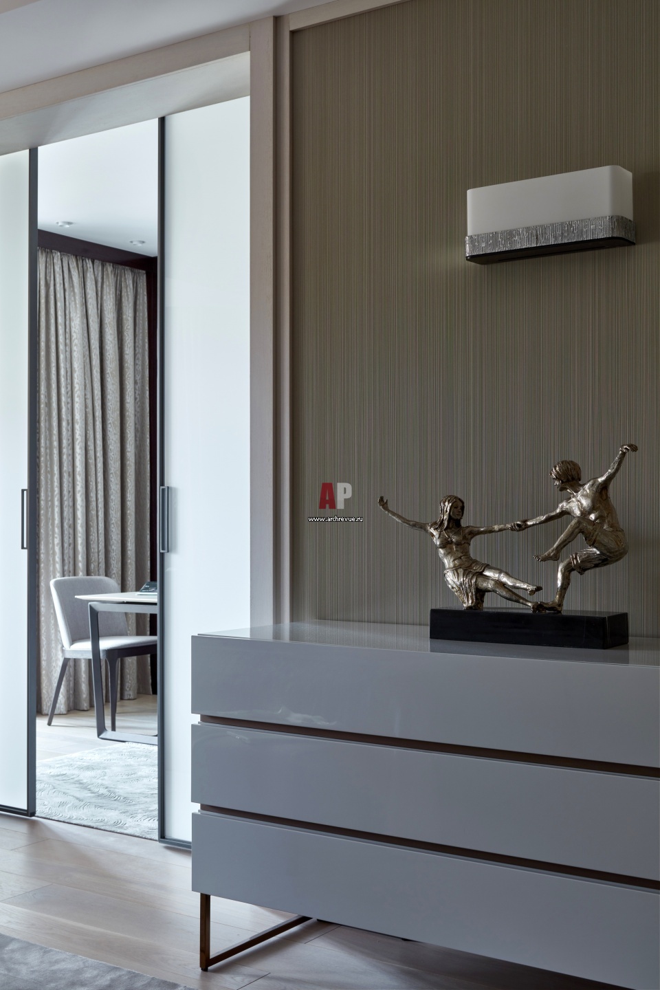Хозяйская спальня объединена с кабинетом, гардеробной и ванной в обособленный блок. Кабинет изолирован раздвижными дверями из матового стекла. Комод, Pianca. Бра, Contardi. Скульптура на комоде Pieter Adam.