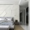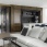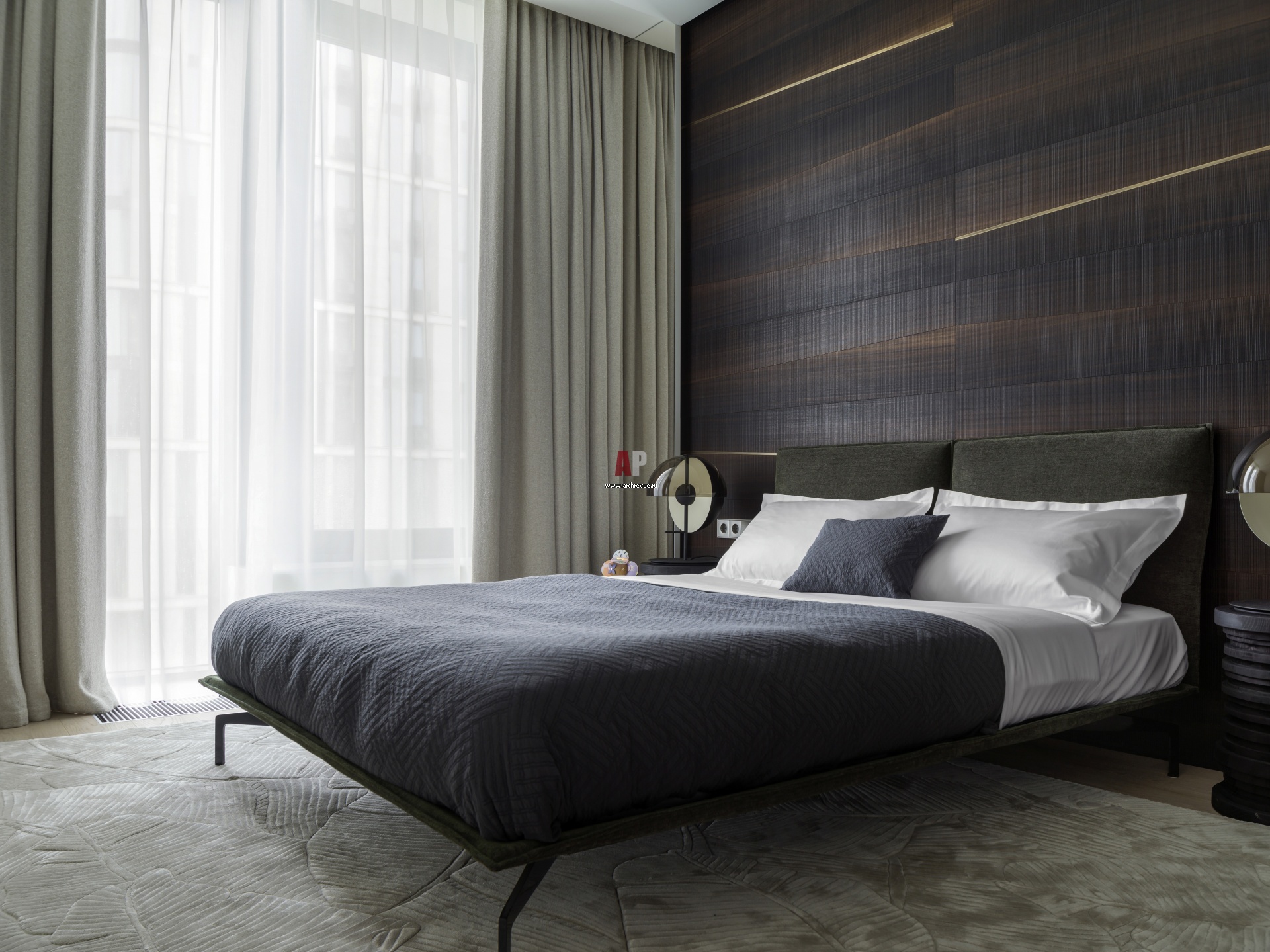 Гостевая спальня оформлена в темных тонах, на контрасте с мастер-спальней. Кровать с двухчастным высоким изголовьем и тонкими ножками, Saba Italia.