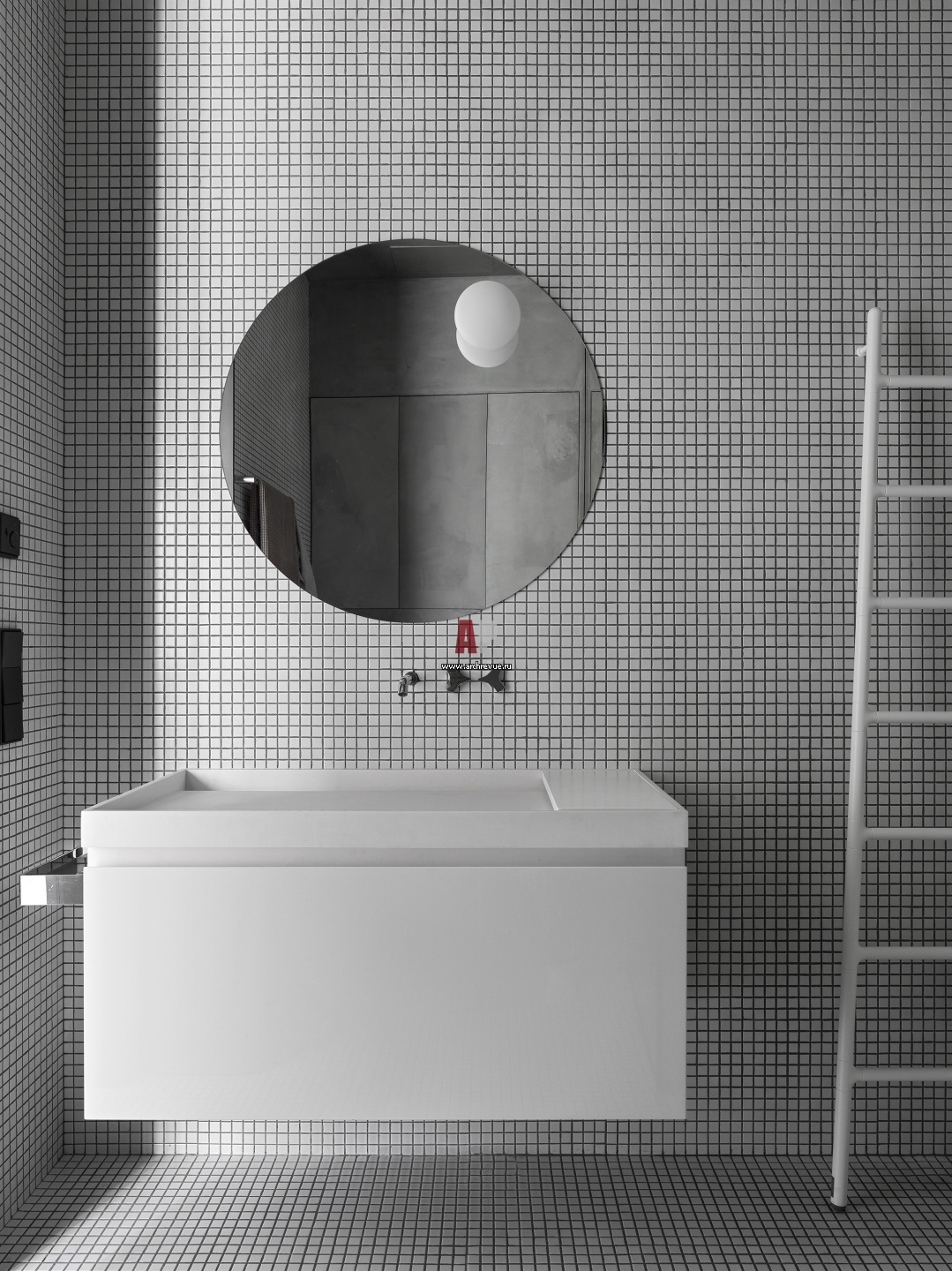 Дизайн ванной комнаты предельно лаконичен. Строгая геометрия и разный масштаб деталей – основа дизайна.
