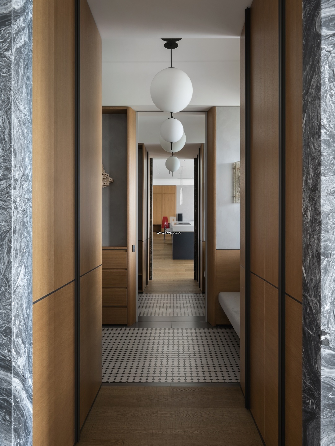 Квартира с анфиладной планировкой в историческом доме в тихом центре Москвы. Входная группа. Зеркало в пол зрительно усложняет перспективу. На полу – метлахская плитка. Дверные откосы выполнены из мрамора.