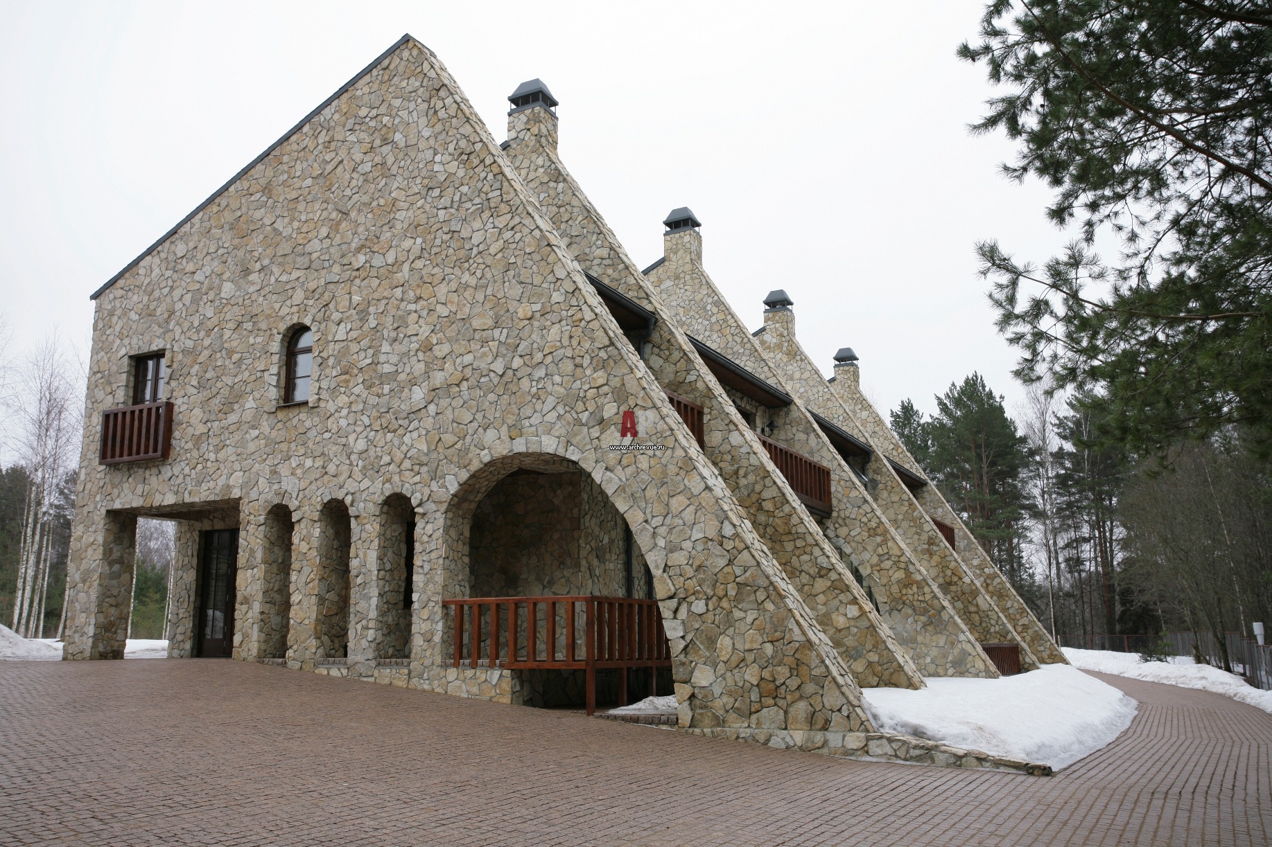 Дом-шато похож на крепость. Для облицовки фасада дизайнеры использовали натуральный песчаник. Главный фасад, вдоль которого расположены панорамные оконные проемы и галереи, опирается на выступы-контрфорсы.