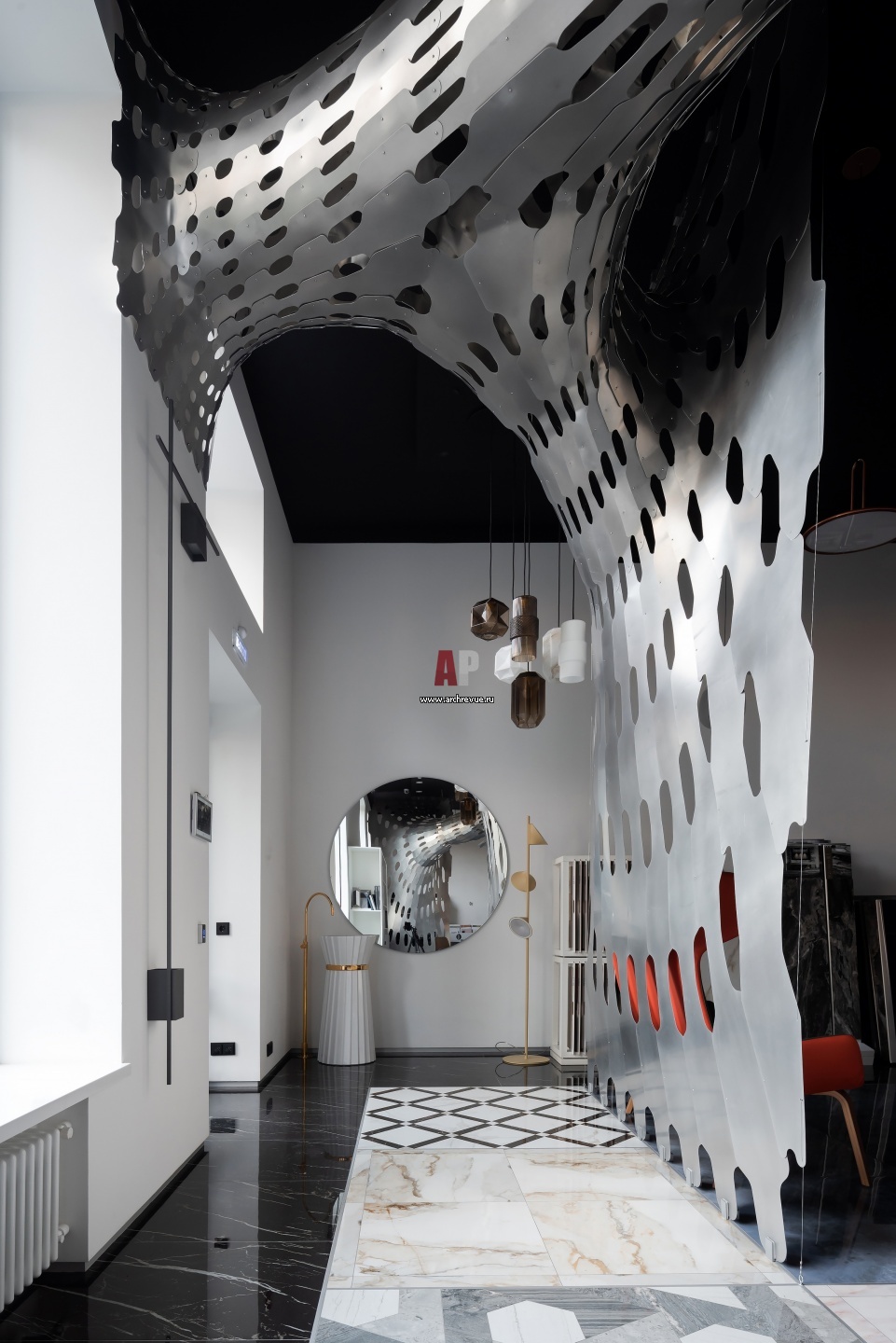 Металлическая конструкция объединяет залы и усложняет простое по форме и лаконичное по наполнению пространство.