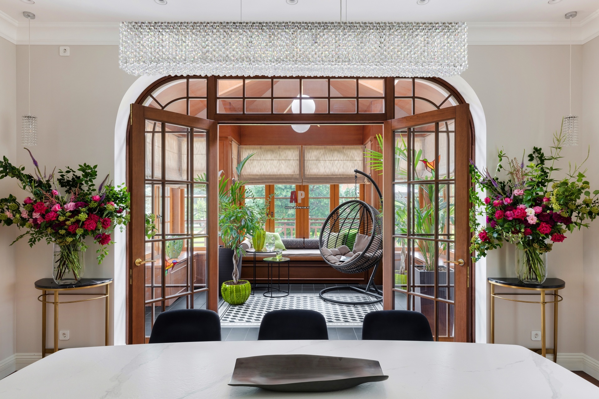 Столовая зона с выходом в зимний сад. Арочный проем с филенчатыми дверями и прозрачными витражами отсылает к интерьерам классических английских особняков. Люстра над обеденным столом, Schonbek. Парные консоли, Rooma Design & Furniture.