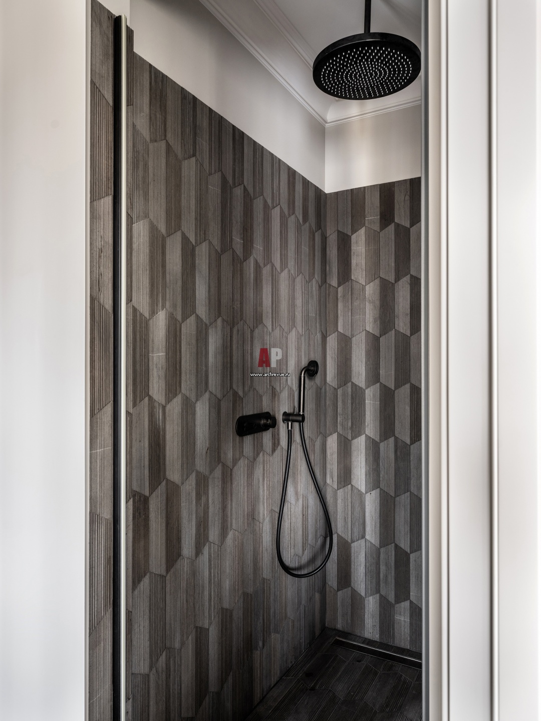 Душевая в хозяйской ванной комнате. Стены отделаны мраморной мозаикой, Lithos Design. Смесители и душ, Fantini.