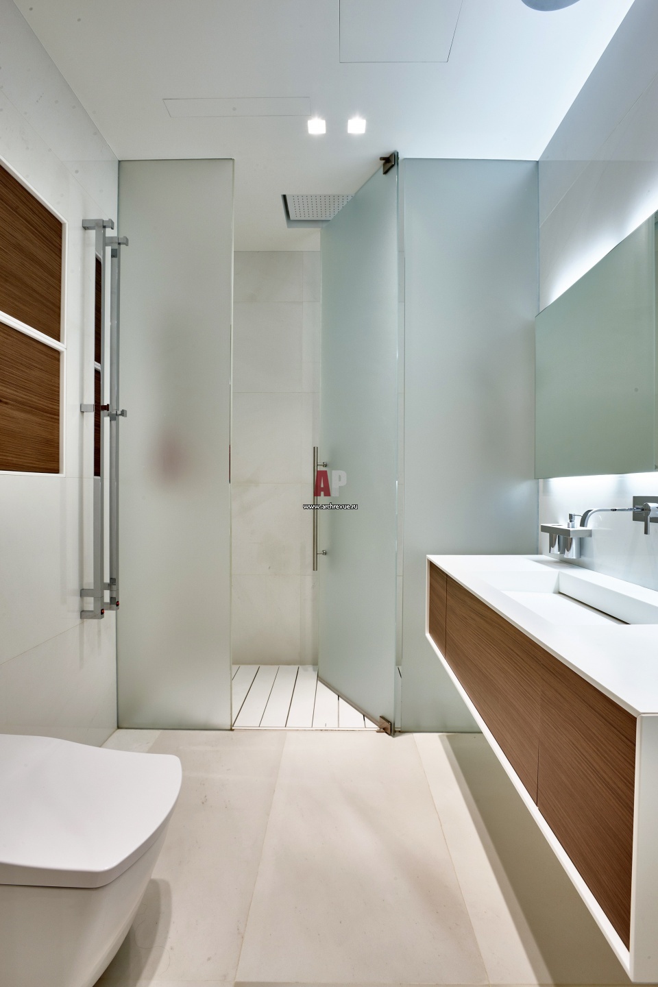 Интерьер санузла в стиле минимализм. Душевая перегородка из матового стекла.
