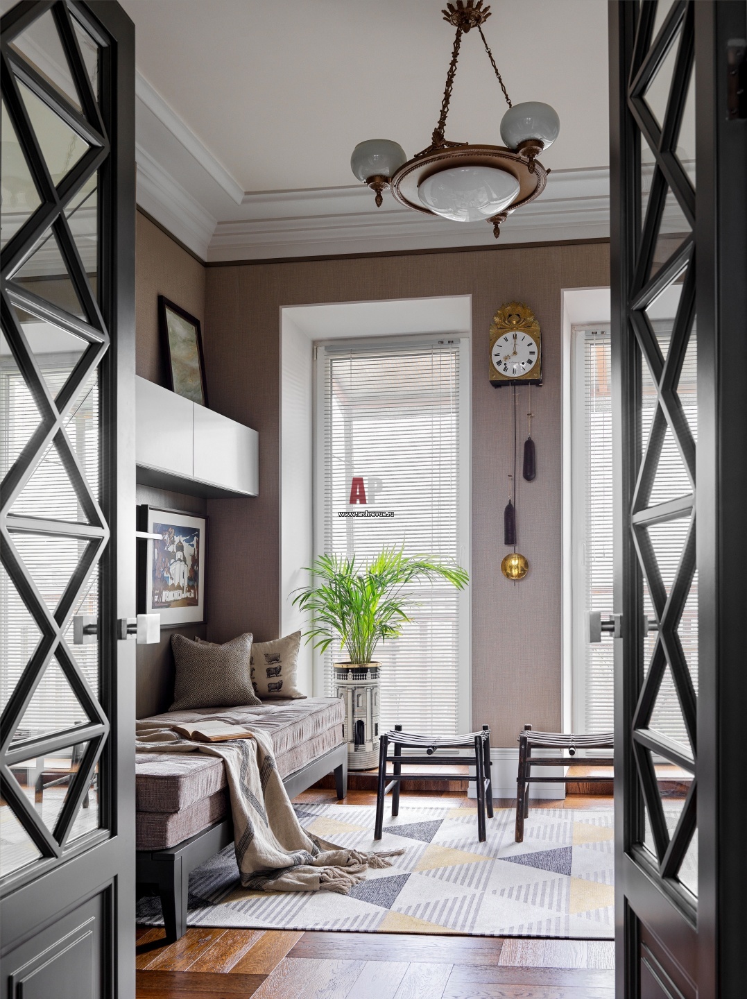 Геометричная расстекловка дверей, ведущих в кабинет, выполнена по образцам советской довоенной архитектуры. Советская люстра 1940-х годов.