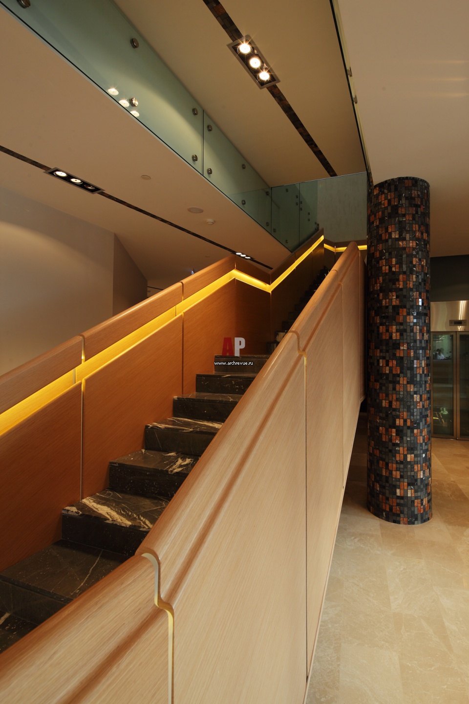 Ограждение лестницы из шпона ясеня со светодиодной подсветкой.