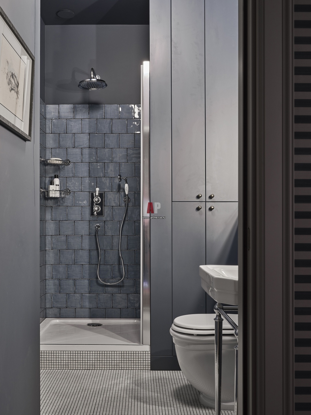 Стены, пол, потолок гостевого санузла окрашены в единый серо-голубой оттенок, такой прием нивелирует эффект от выступающих вентиляционных и сантехнических коробов. Керамическая плитка с акварельным эффектом и глазурью, Original Style, коллекция Winchester Arcadian.