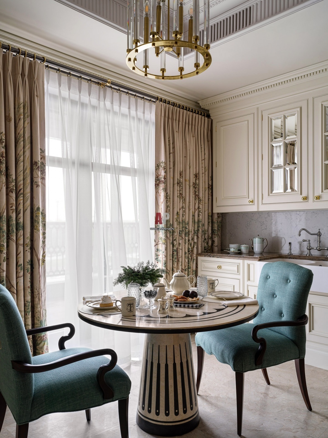 Зона для завтраков на кухне. Круглый стол с инкрустацией, Maitland Smith. Латунная люстра, Hudson Valley Lighting.