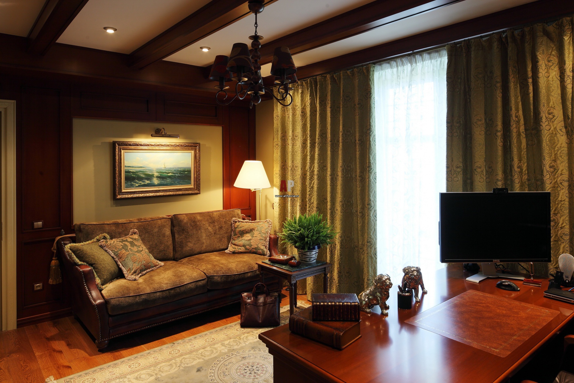 Фото интерьера мужского кабинета на втором этаже. Диваны, Montellassi. Стеновые панели, двери, потолочная раскладка из тонированного дуба изготовлена на заказ.