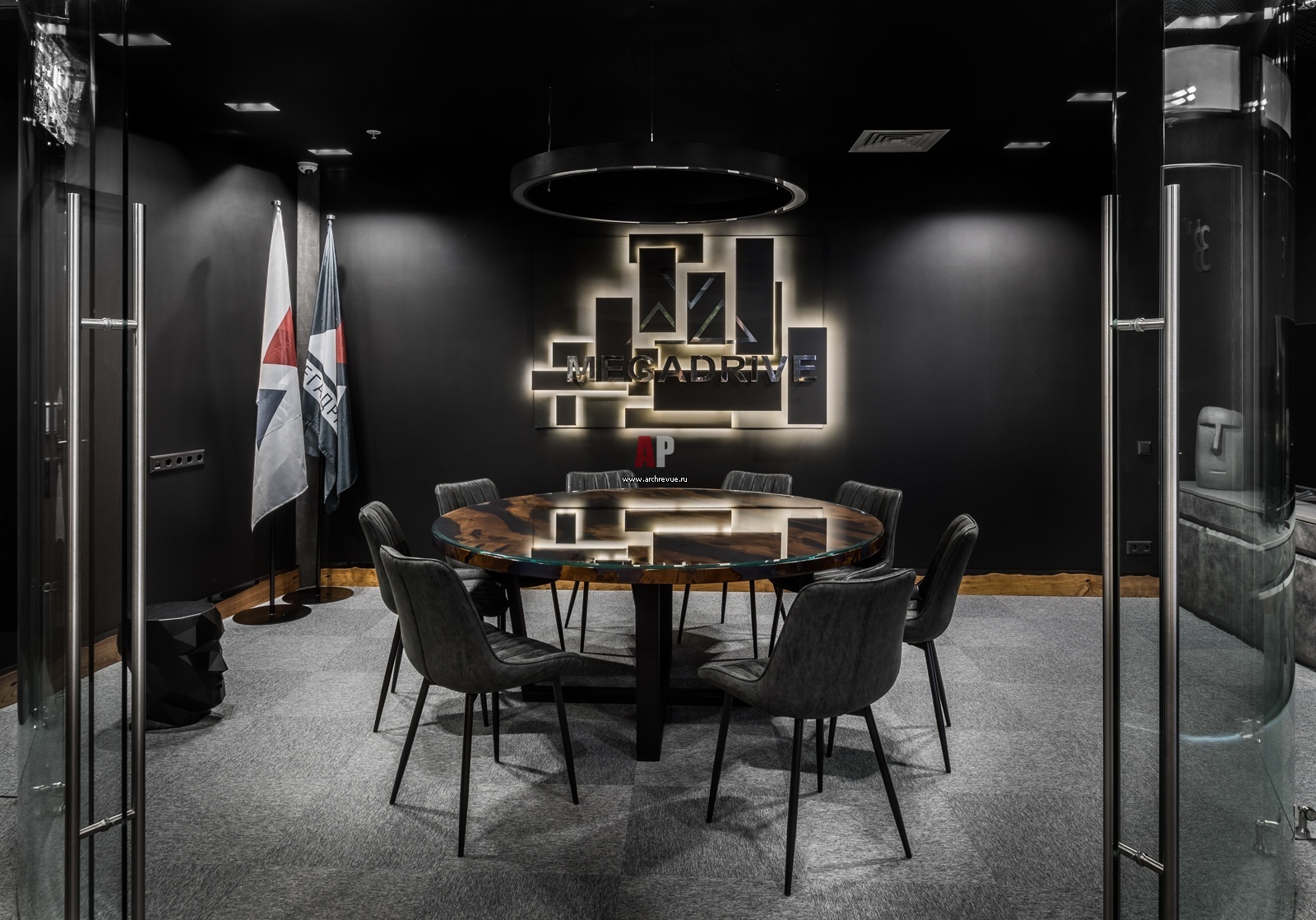По центру черной переговорной – круглый стол из массива окаменелого дерева. Оригинальный плинтус из деревянного слэба, залитого смолой.