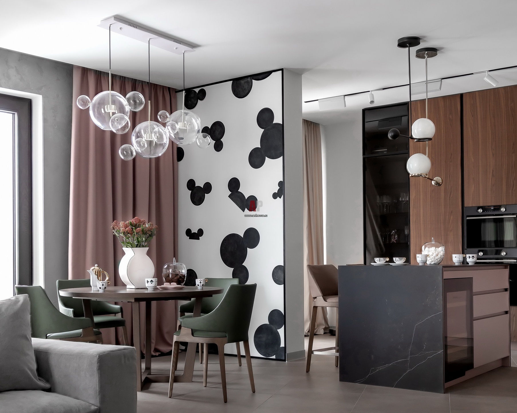 Квартира для молодой семьи с модными фишками. Интерьер гостиной-кухни. Паркет, американский орех. Керамогранит, Mirage. На кухонном острове – ваза, Montgolfier; чайный и кофейный сервиз, Bosa; емкости для хранения «Яблоки», Riviera Maison.