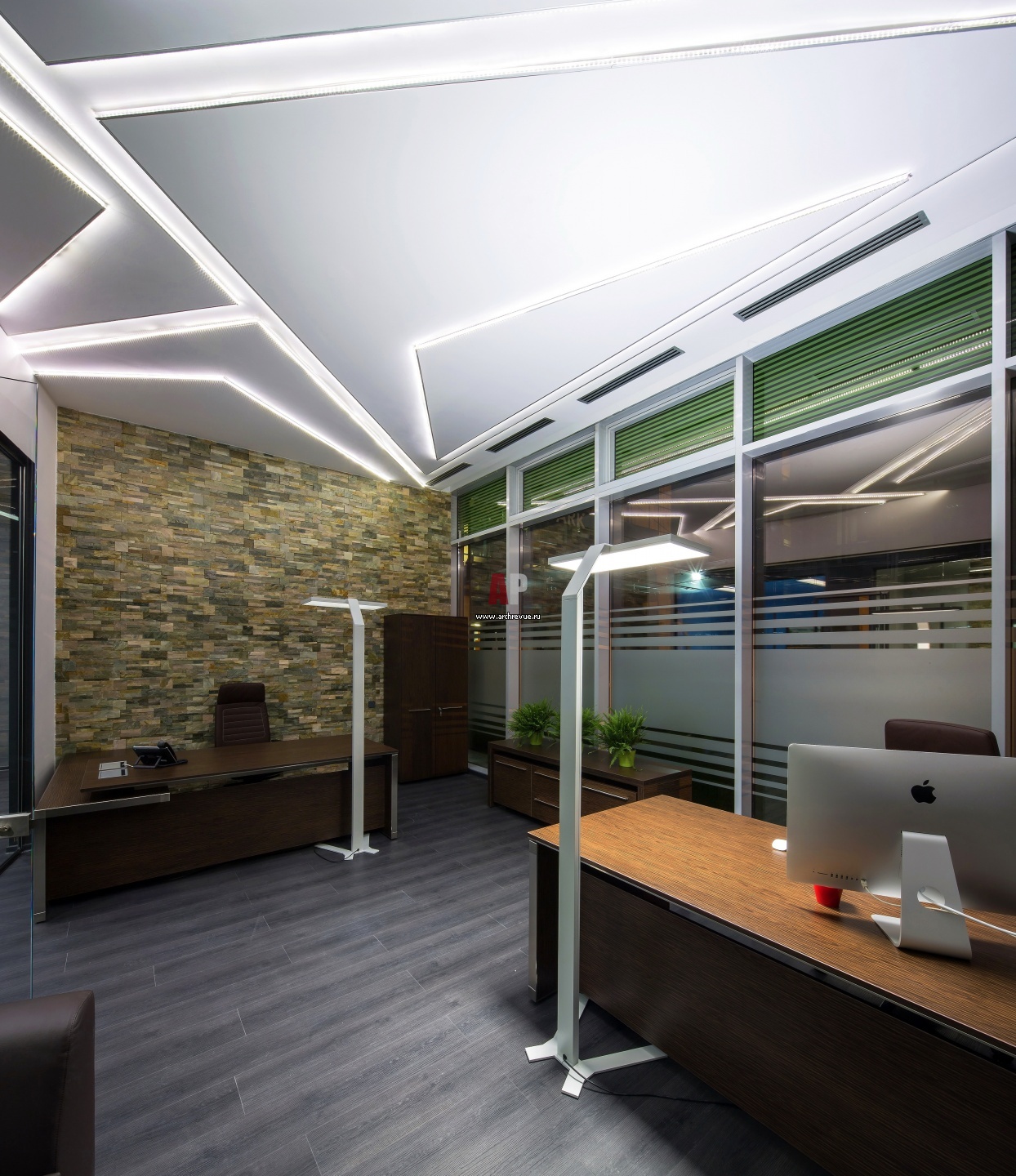 Особое внимание уделено шумоизоляции. В проекте присутствуют звукопоглощающие подвесные потолочные системы и напольные бесшумные покрытия.