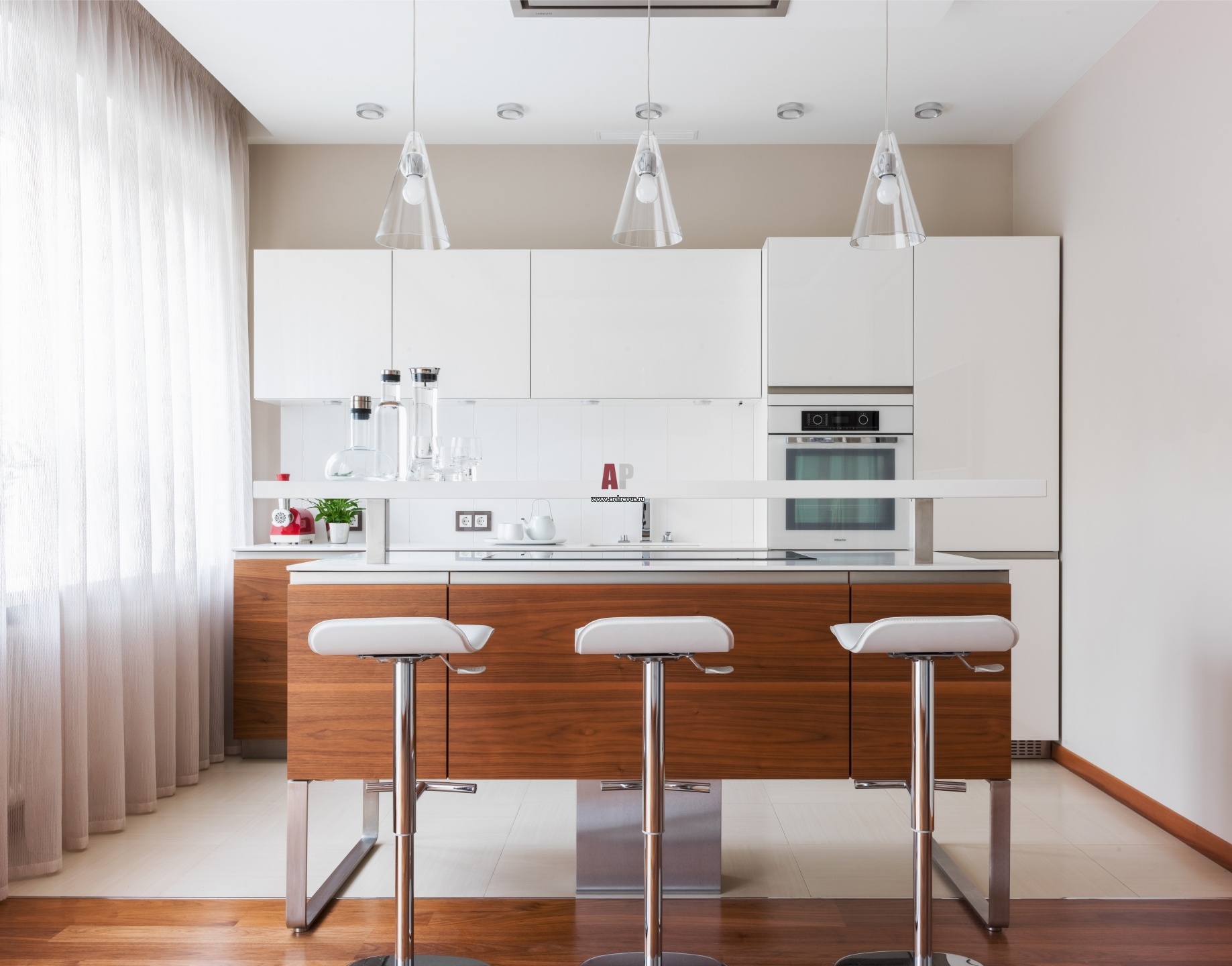 Кухня занимает отдельное изолированное помещение. Она создана путем объединения двух помещений: самой маленькой жилой комнаты и 10-метровой советской кухни. На полу – керамогранит, FAP Ceramiche. Кухня, Rational. Барные стулья, Bontempi.