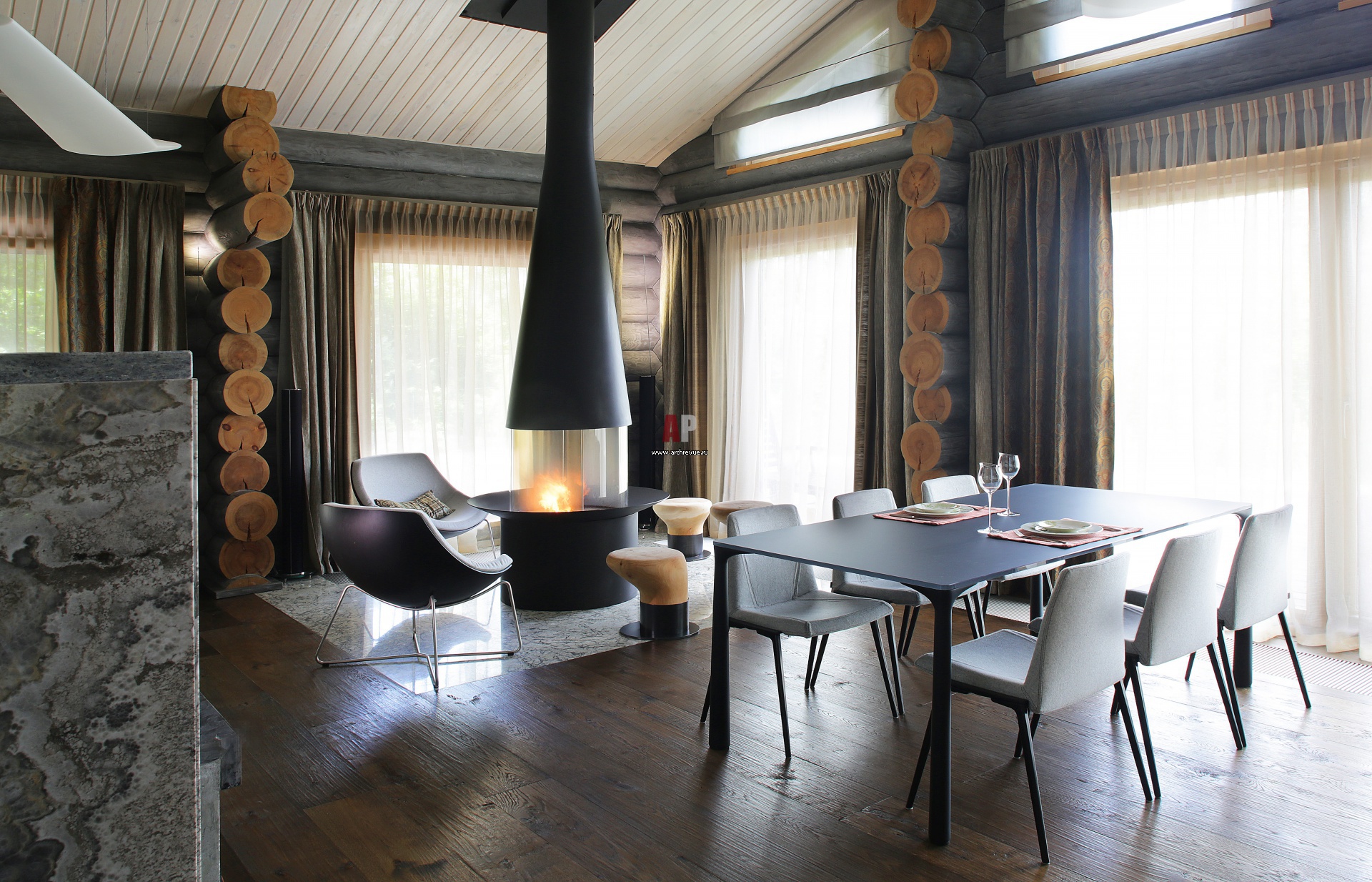 Доминанта интерьера гостиной – камин Focus, модель Filiofocus (дизайнер Доминик Имбер). Вокруг островного камина – кресла от LaPalma и табуреты от Riva 1920.