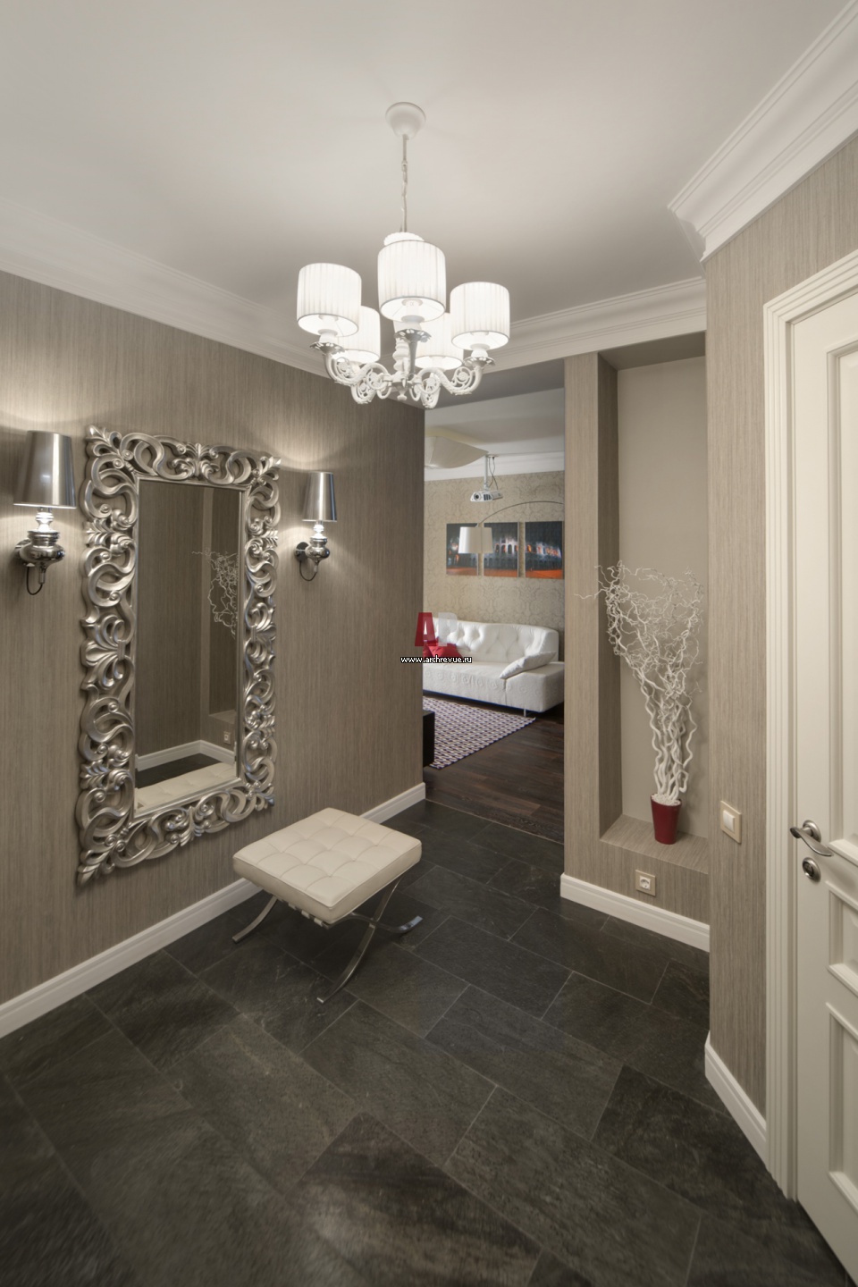 Прихожая в стиле фьюжн. Полы облицованы крупноформатной плиткой из натурального сланца. Двери, порталы дверей выкрашены в цвет слоновой кости.