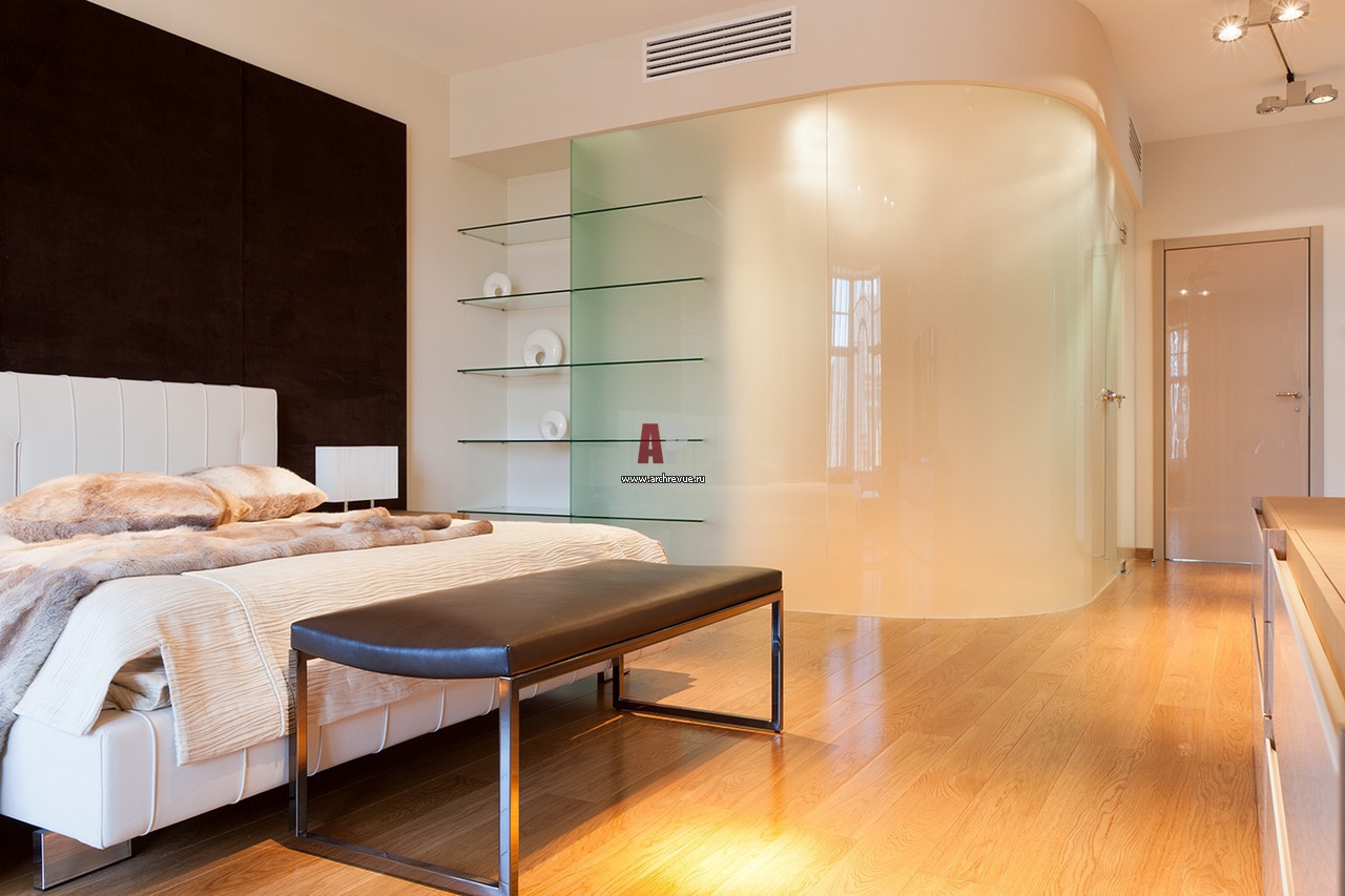 Блок ванной комнаты в хозяйской спальне выделен округлой стеной из гнутого матового стекла. Стена за изголовьем кровати отделана панелями из темной кожи. Кровать из белой кожи, Molteni&C. Лампы, Vibia.