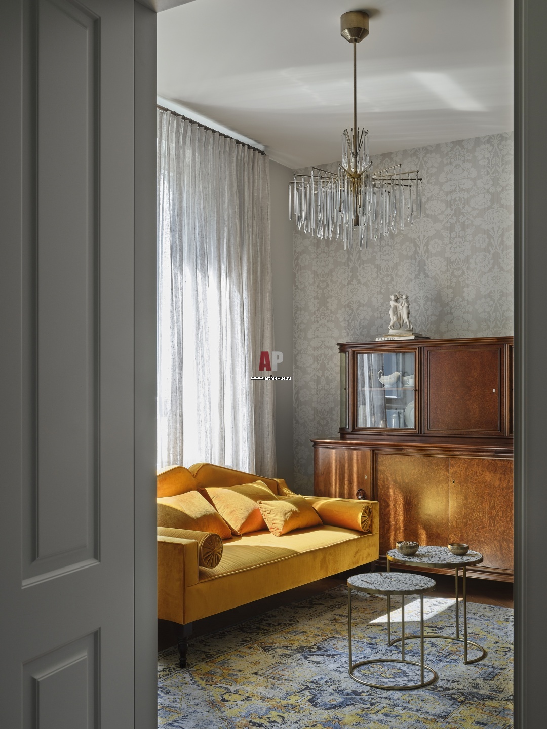 Диван для двоих (loveseat) цвета медовой горчицы, Loffilab. Люстра куплена в антикварном магазине из Италии и отреставрирована. Обои с рисунком «дамаск», Farrow&Ball.