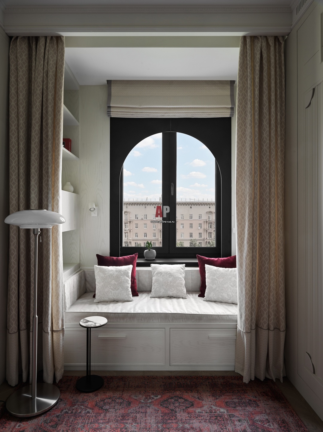 Зона отдыха в столовой. Диван под окном сделан на заказ. Украшение интерьера - арочное обрамление окна, изготовленное на заказ из выкрашенного в черный цвет дерева. Приставной столик, Cattelan Italia.