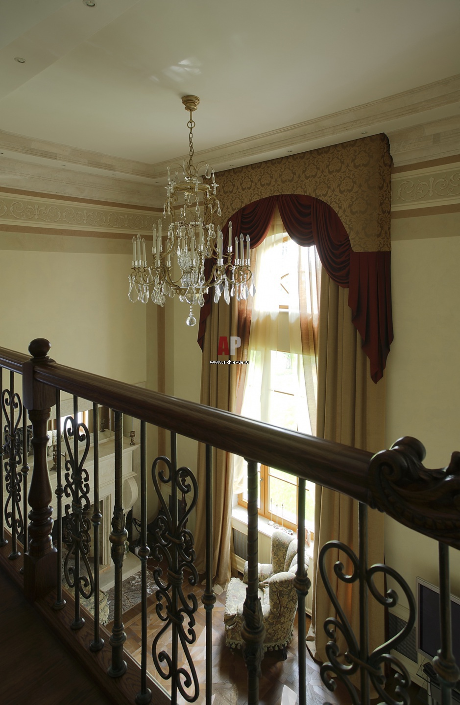 С балкона второго этажа открывается парадный вид на гостиную с камином. Потолочные карнизы выполнены из резного травертина.