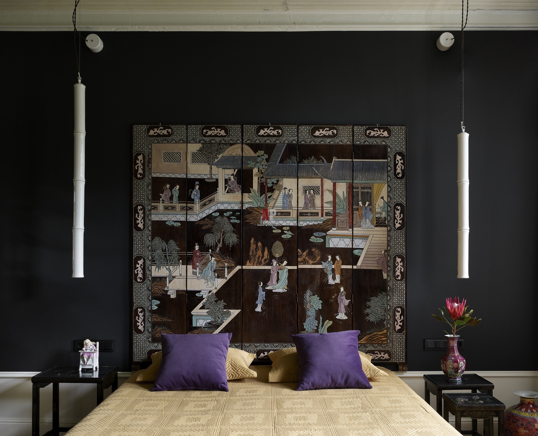 Один акцент спальни – большая китайская ширма, которая заменила собой изголовье кровати. Настенные бра, Versmissen.