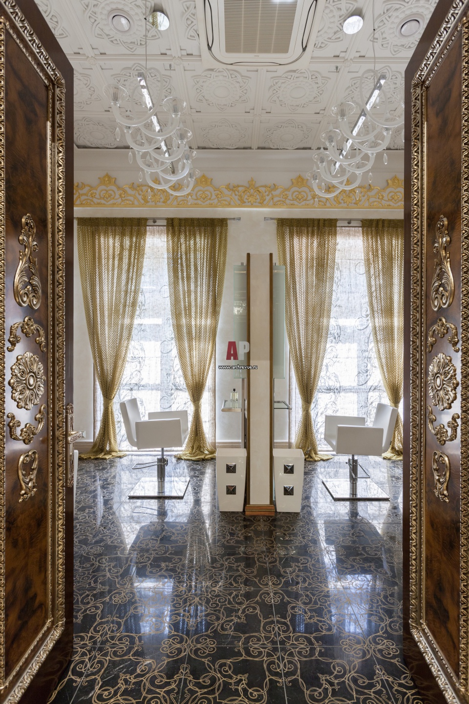 Парикмахерский зал выполнен в современной классике. Двустворчатые распашные двери с инкрустацией из корневой части с резьбой и позолотой от Sige Gold. Два места разделены двусторонним зеркалом. Лепные потолки рифмуются с дизайном полированного пола.