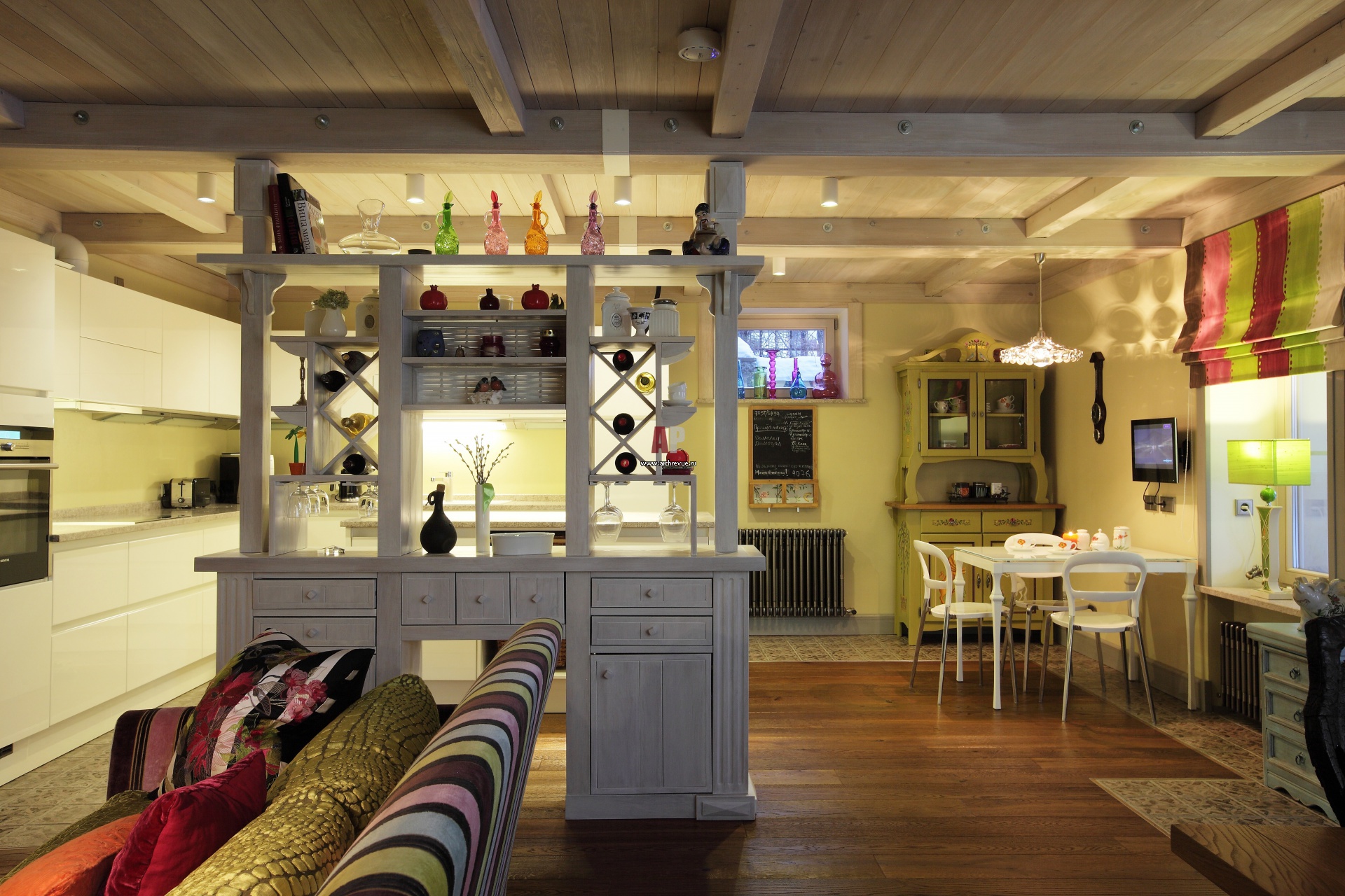 Кухня-столовая в цокольном этаже. От зоны отдыха кухня отделена двусторонним стеллажом.