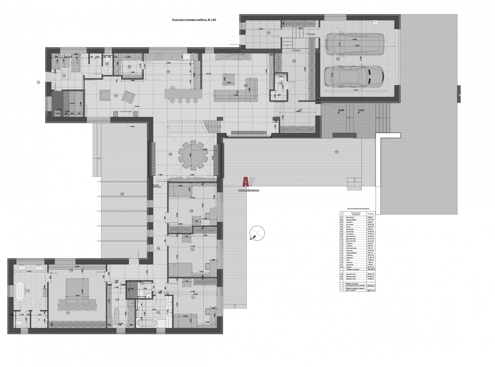 Общая площадь – 550 кв. м. Планировка 1 этажа 2-х этажного дома с индивидуальной архитектурой для семьи с тремя детьми