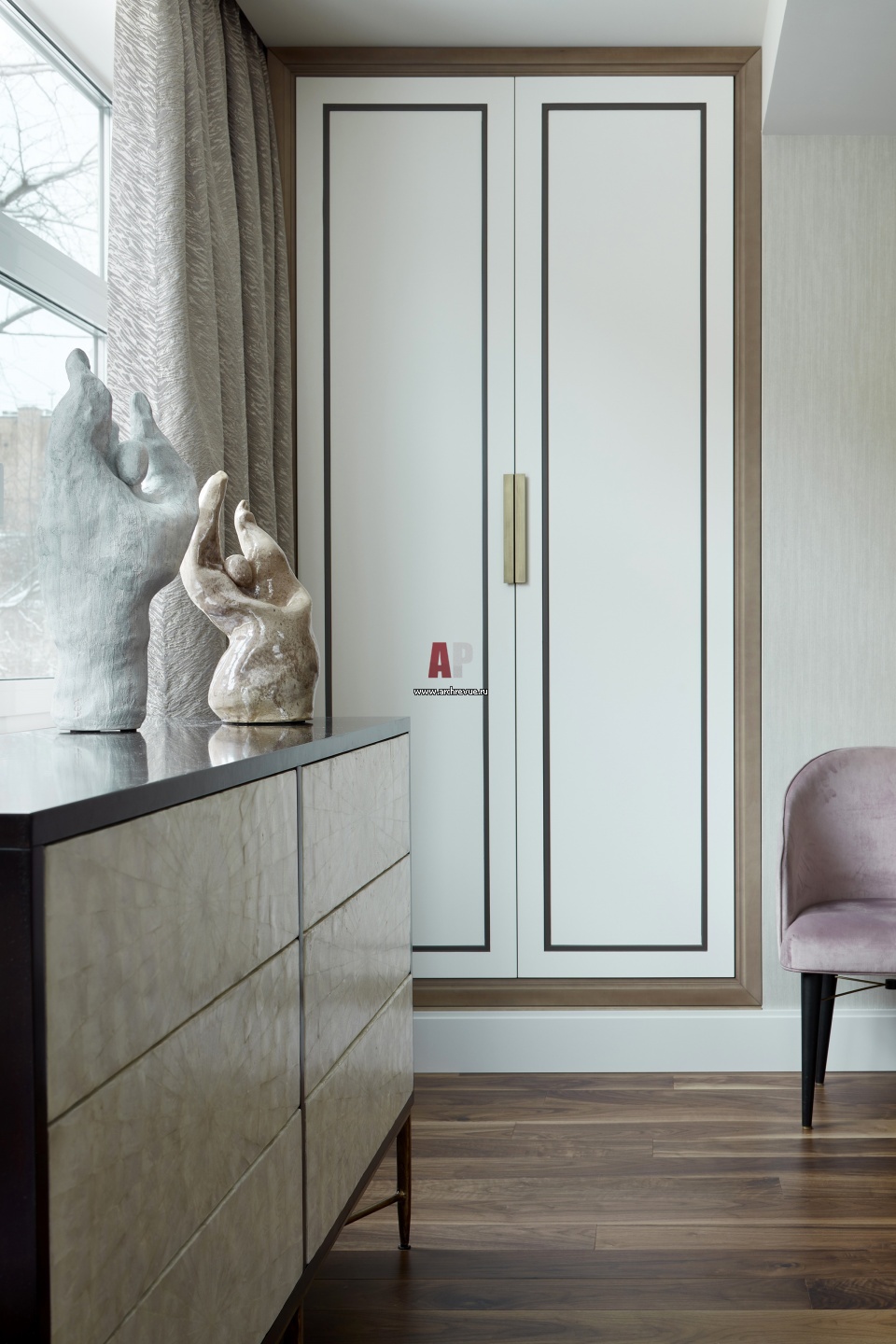 Интерьер спальни. Белый встроенный шкаф, на заказ. Комод, Bernhardt. Стул, Any Home.