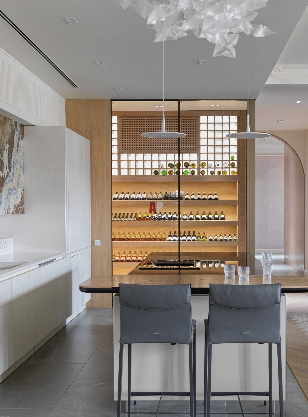 Интерьер кухни и винотеки. Полки для вина оснащены подсветкой, при включенном свете они становятся доминантной гостиной.